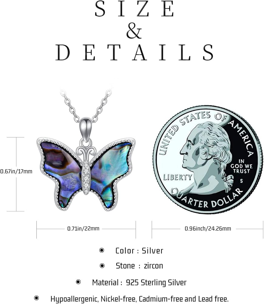 🍎المادة☀: قلادة فراشة صدفة أذن البحر مصنوعة من الفضة الإسترلينية النقية، خالية من النيكل والرصاص والكادميوم ومضادة للحساسية. مناسبة للنساء والرجال من أي عمر.