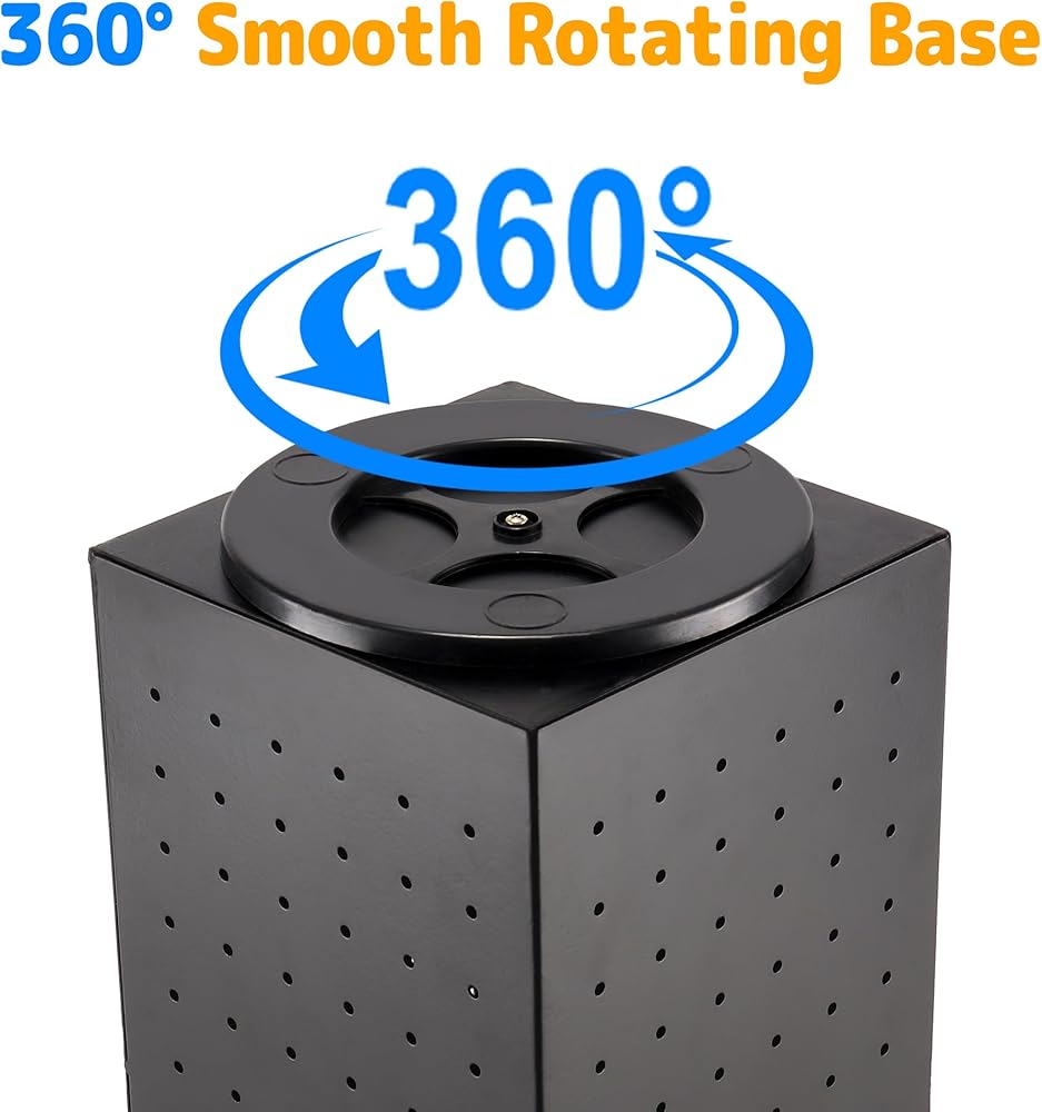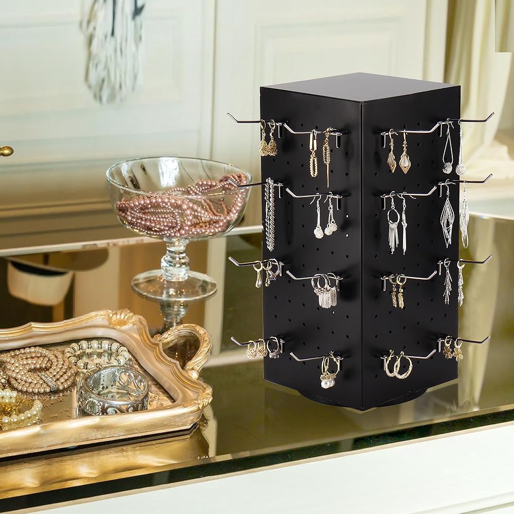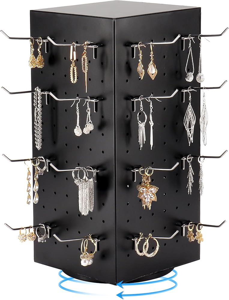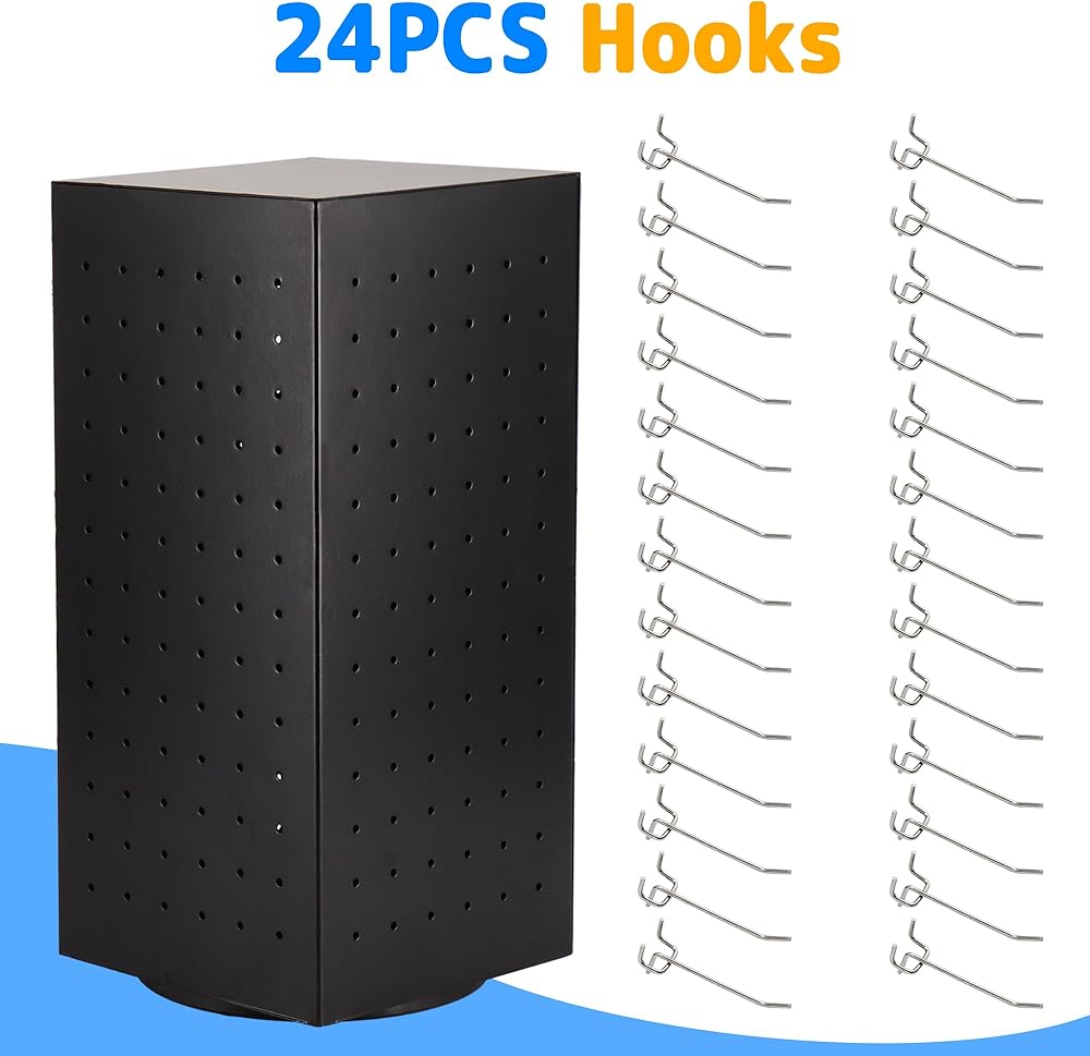 • مجموعة عرض لوحة تثبيت رائعة: سوف تحصل على 1 حامل عرض دوار + 24 قطعة من خطافات لوحة التثبيت + 24 قطعة من الأغطية الواقية للخطاطيف المطاطية، قم بتخزين وعرض مجوهراتك أو إكسسواراتك بشكل أنيق، لا مزيد من الفوضى على أسطح الطاولة!
