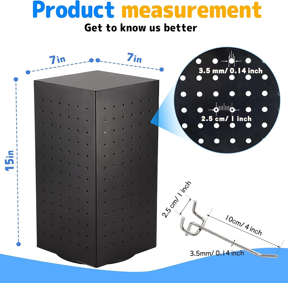 • حامل لوح تثبيت بمساحة كبيرة: يتميز عرض البيع بالتجزئة بلوح تثبيت من 4 جوانب، مقاس 4 انش × 12 انش، ويمكنك ضبط موضع الخطاف بحرية ليناسب حجم المنتج، مثالي لحمل الأقراط والقلائد والأساور وسلاسل المفاتيح وربطات الشعر وما إلى ذلك.