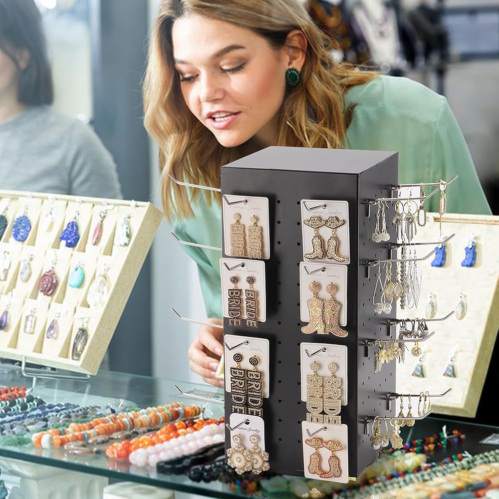 • شاشة عرض دوارة 360 درجة: حامل عرض الأقراط مع قاعدة ثابتة دوارة 360 درجة، تدور بسلاسة وبدون مجهود، مما يوفر تأثير عرض جيد، مما يسمح للعملاء برؤية بضائعك بسهولة ووضوح