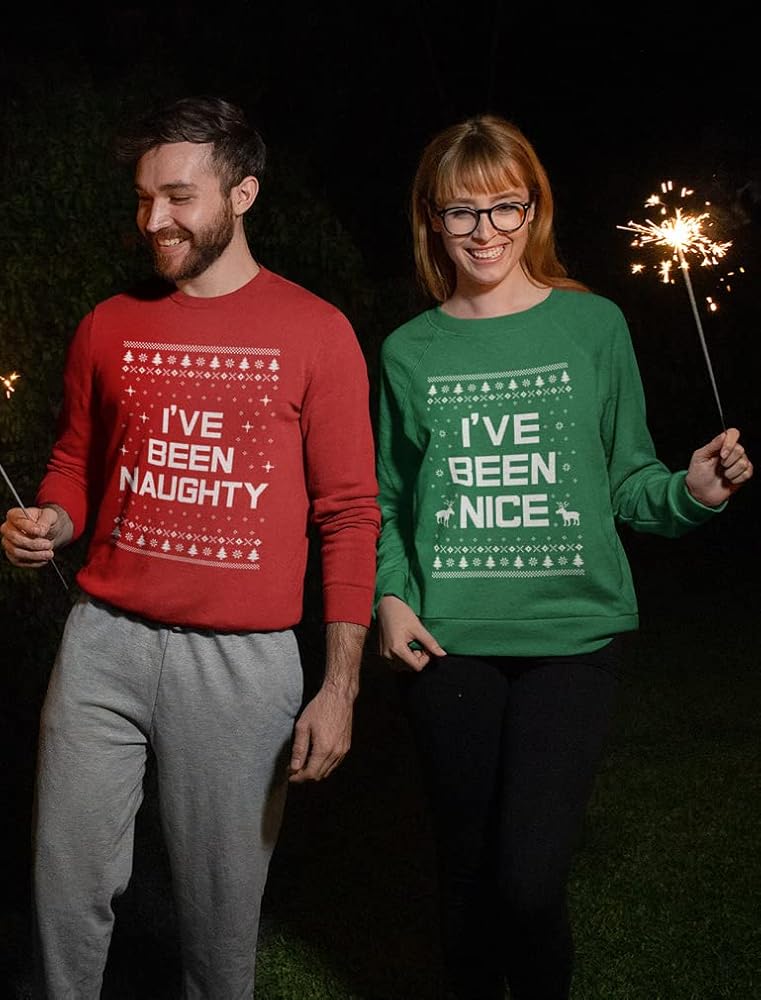 سترة عيد الميلاد القبيحة للرجال والنساء؛ لقد كنت شقيًا، لقد كنت لطيفًا. ملابس رائعة للزوجين متطابقة لقضاء العطلات