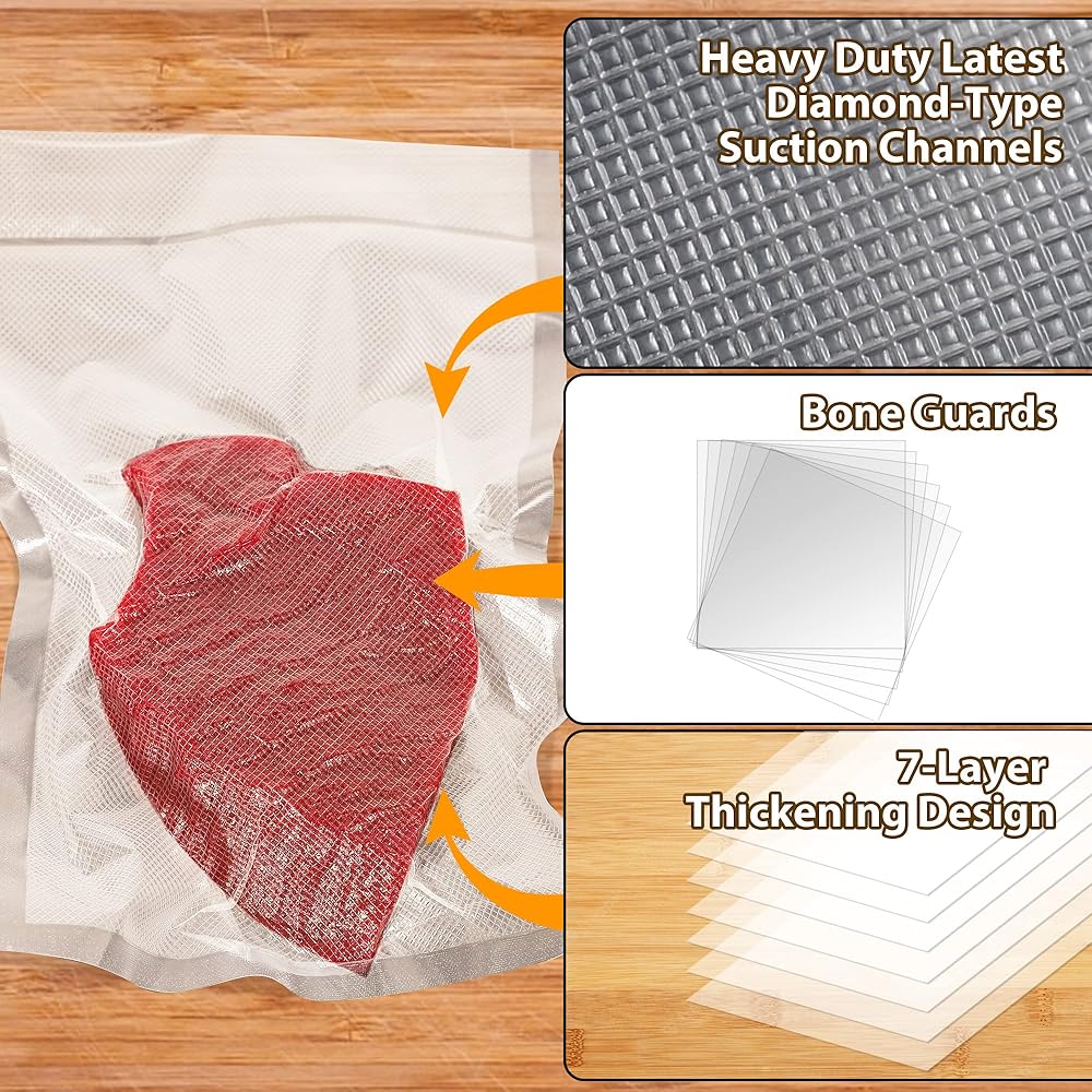 【أكياس متينة لحفظ الطعام خالية من البيسفينول أ مع واقي عظام مضاد للثقب】تعتمد أكياس تفريغ الطعام تصميمًا بسمك 4 مل من طبقة واحدة ومواد شديدة التحمل مكونة من 7 طبقات من البولي إيثيلين + البولي إيثيلين، مع أحدث شبكة ماسية متعددة النقاط. التكنولوجيا، لضمان امتصاص الهواء بسرعة ومنع حرق الفريزر أو الجفاف. تضمن أكياس الغلق المفرغة مع واقيات العظام السميكة عدم ثقب الأشياء الحادة في الحقيبة، مما يساعدك على الاستخدام بدون قلق