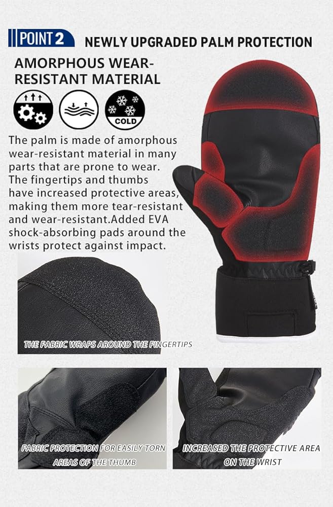 • الأصفاد الطويلة تبقي الثلج خارجاً. مناطق أطراف الإبهام مصنوعة من مواد متوافقة مع الهواتف الذكية ويمكن تشغيلها أثناء ارتداء القفازات. جيوب إغلاق بشريط فيلكرو أعلى وأسفل السحاب على الجزء الخلفي من اليد لتخزين تذاكر الرفع وتدفئة اليد وغيرها من الأشياء.