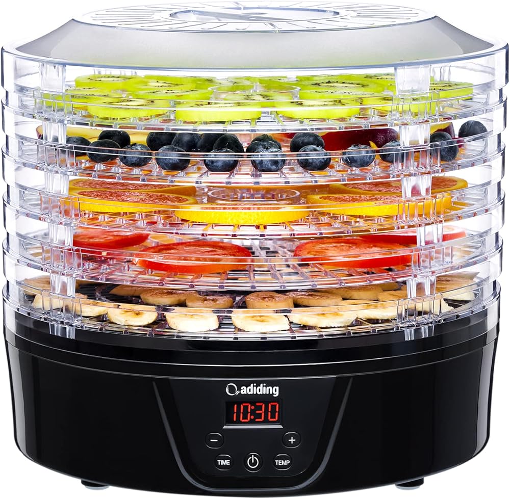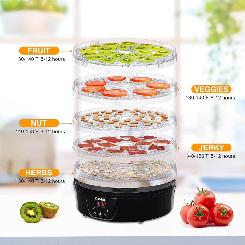 آلة تجفيف الطعام، مجفف إضافي مع 5 صواني خالية من مادة BPA، مؤقت رقمي وتحكم في درجة الحرارة، مجفف طعام بقدرة 350 وات للفواكه والخضروات واللحوم ولحوم البقر والأعشاب المتشنجة ومكافآت الحيوانات الأليفة