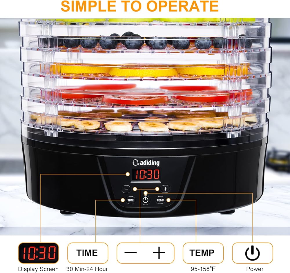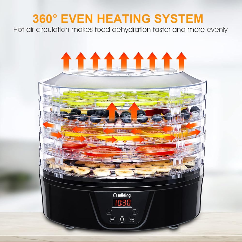 اختيار متنوع للطعام - مع قوة عالية تبلغ 350 وات لآلة تجفيف الطعام هذه، يمكنك صنع الفواكه المجففة والأطعمة المقدد لأطفالك، ومكافآت صحية لحيواناتك الأليفة والأعشاب الجافة لتخزين أفضل. يوفر عنصر التسخين السفلي دوران الهواء الساخن بشكل مستمر 360 درجة، مما يجعل جفاف الطعام أسرع وأكثر توازناً.