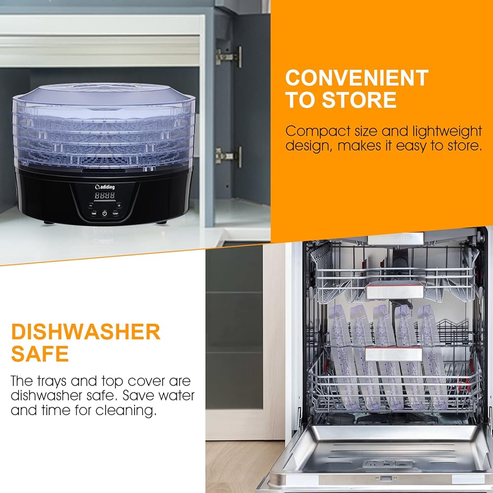 سهل التنظيف والتخزين - الصواني الخمسة لهذا المجفف آمنة للغسل في غسالة الأطباق، وسهلة ومريحة للتنظيف، وتوفر وقتك بشكل أفضل؛ يمكن تنظيف قاعدة مجفف الطعام هذا بسهولة بقطعة قماش مبللة أو إسفنجة. الصواني القابلة للتكديس تجعل من السهل تخزينها، ويمكنك وضعها على سطح الطاولة ولا تشغل سوى جزء صغير من المساحة