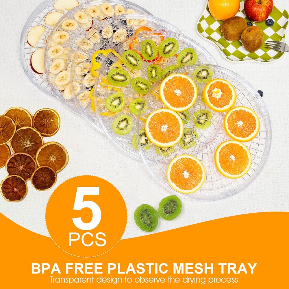 4 صواني شبكية كبيرة خالية من مادة BPA - تأتي آلة تجفيف الطعام هذه مع 4 صواني، والتي يمكن تعديلها بسهولة إلى ارتفاعين، وهي مريحة لتجفيف الأطعمة ذات السُمك المختلفة. مادة بلاستيكية خالية من مادة BPA متينة وتضمن أن الطعام الذي تصنعه آمن. التصميم الشفاف مناسب جدًا لك لمراقبة حالة التجفيف في أي وقت
