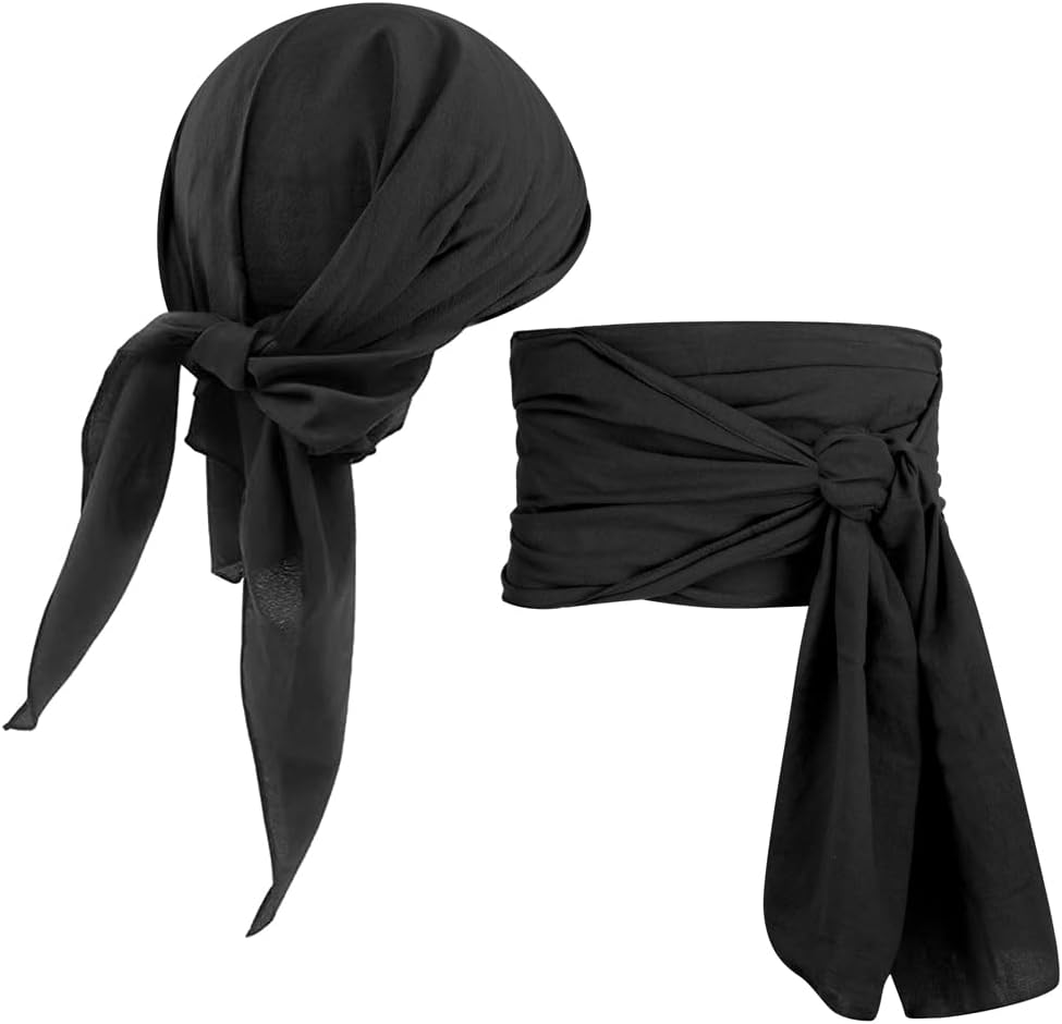 1.Pirate Costume Set: you will receive 1 pcs black pirate head scarf and 1 pcs black pirate sash and 1 pcs skeleton necklace; which is an ideal combination set for your Halloween party costume;