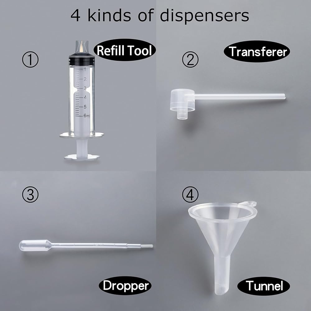 • Package:2 Pack glass bottle 4:Atomizer for fragrance:We presented 4 kinds of aids for dispensing perfume: 1. Syringe 2. Funnel 3. Dropper 4. Perfume Refill Tools Diffuser Funnels Cosmetic Pump Dispenser Portable sprayer refill pump bottle Filling device.