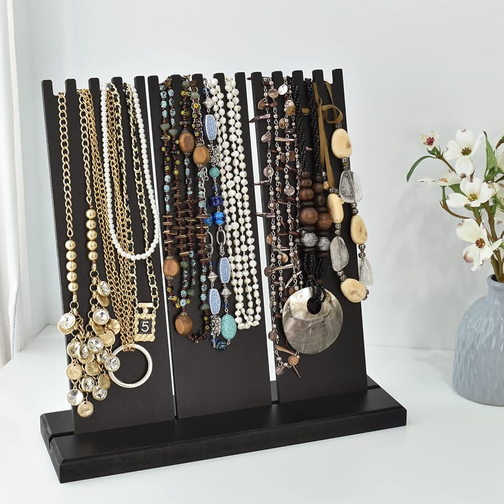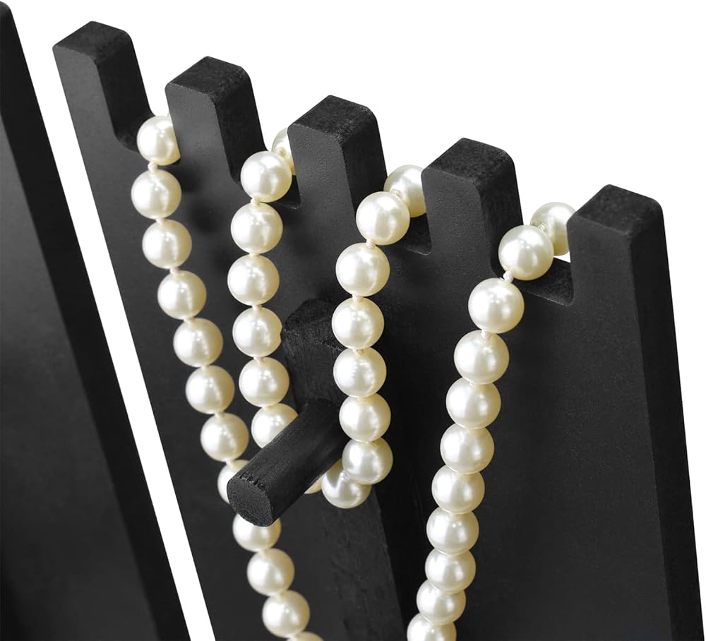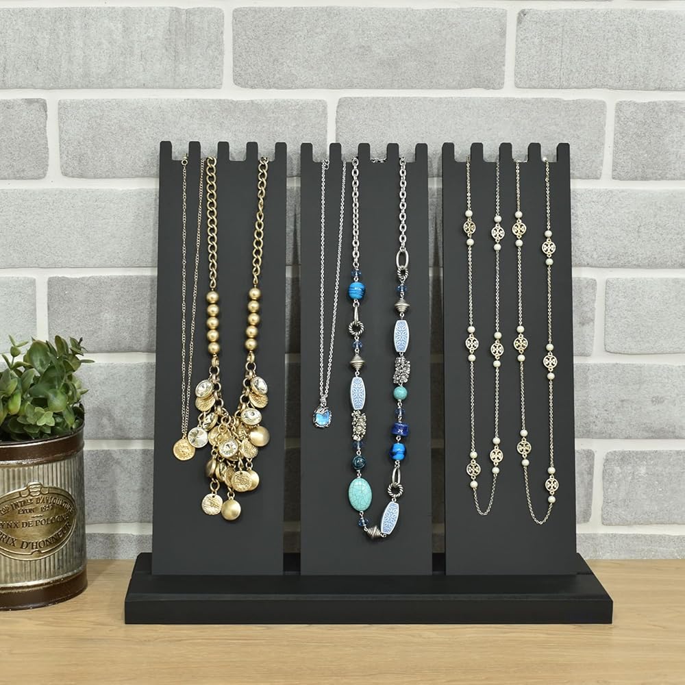 عرض عقد خشبي قائم بذاته - إجمالي 3 ألواح. يتميز الجزء العلوي من الشاشة بفتحات لتعليق القلائد والأساور والسلاسل وحتى الخواتم بأناقة لعرض ديناميكي. تستوعب ما يصل إلى 15 قطعة من القلائد.