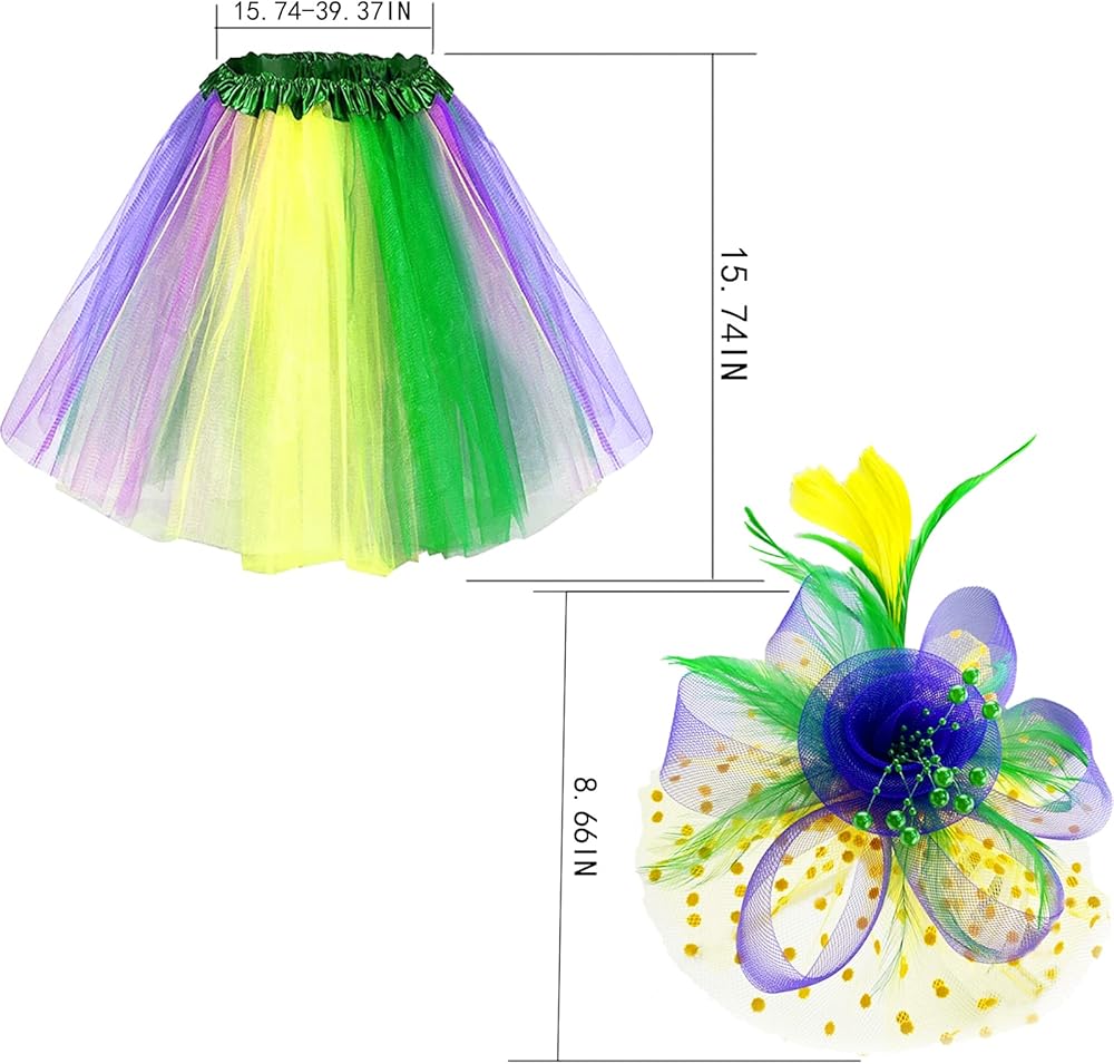 PACKAGE INCLUDES:1 piece tutu skirt, 1 Multi-Color Hair band, size: Waist circumference 60-100cm, skirt length 40cm,which can complete your Mardi Gras dress up