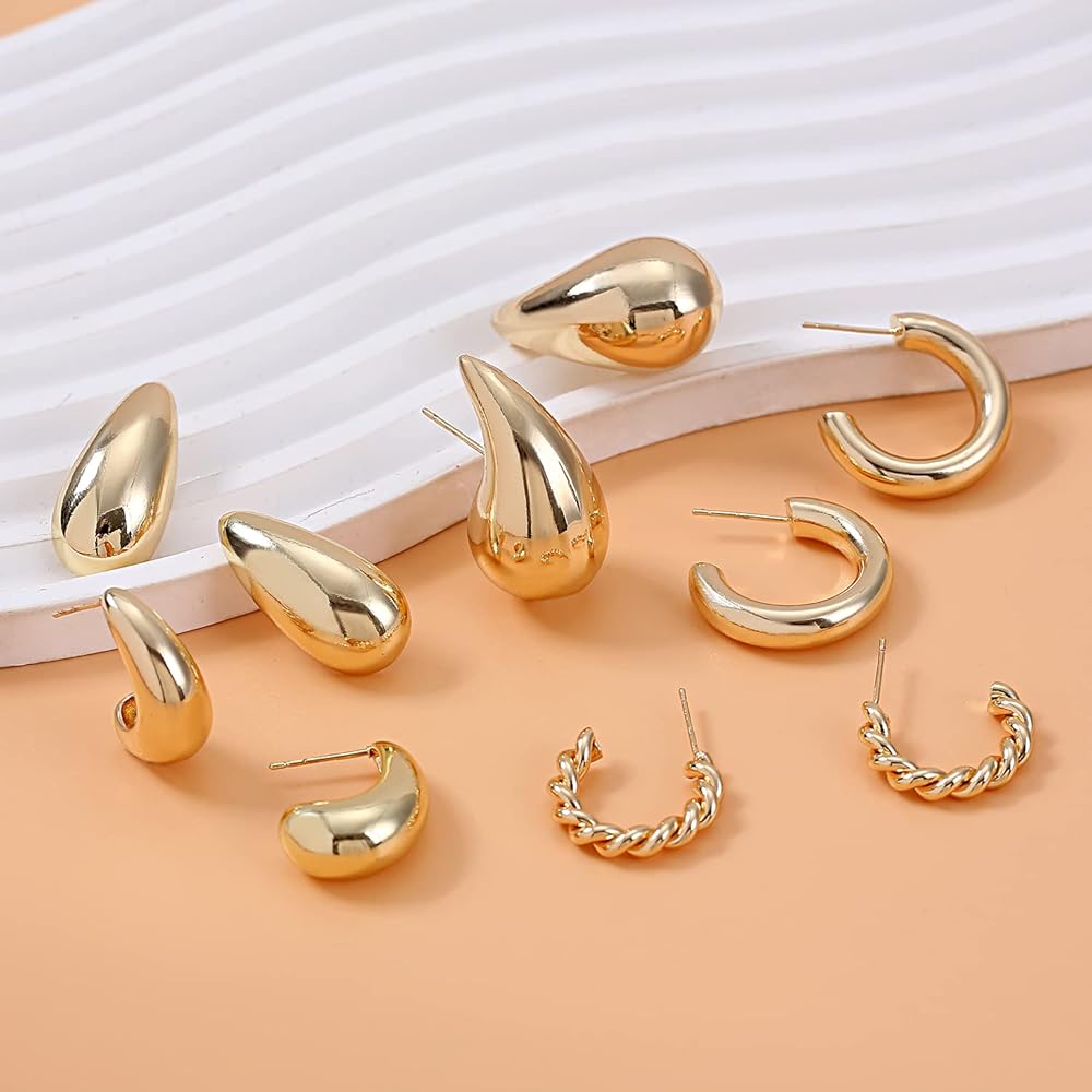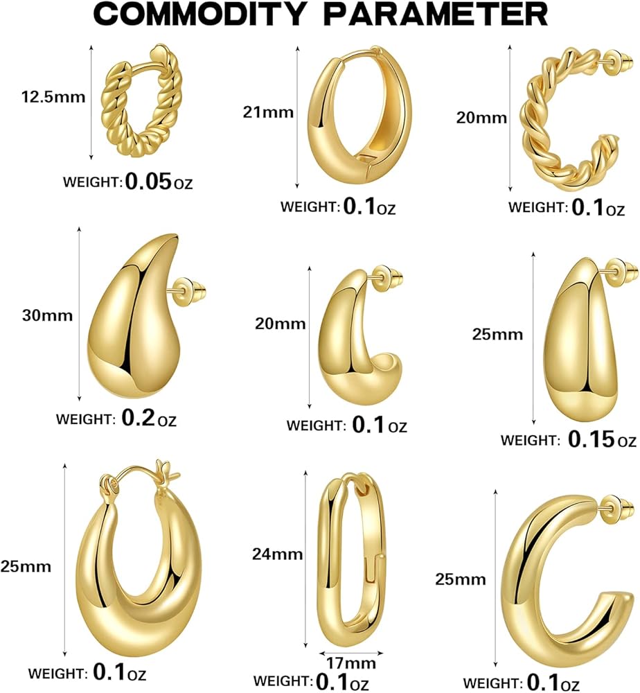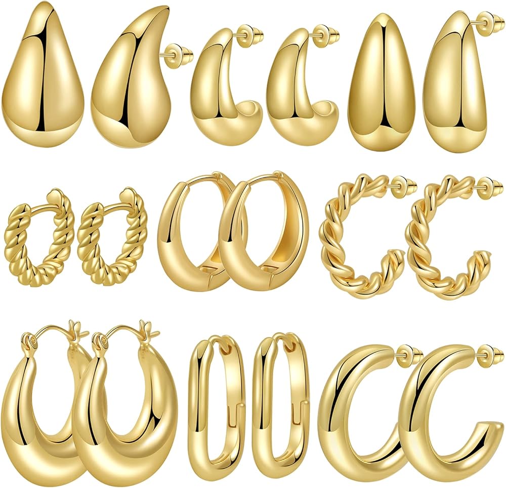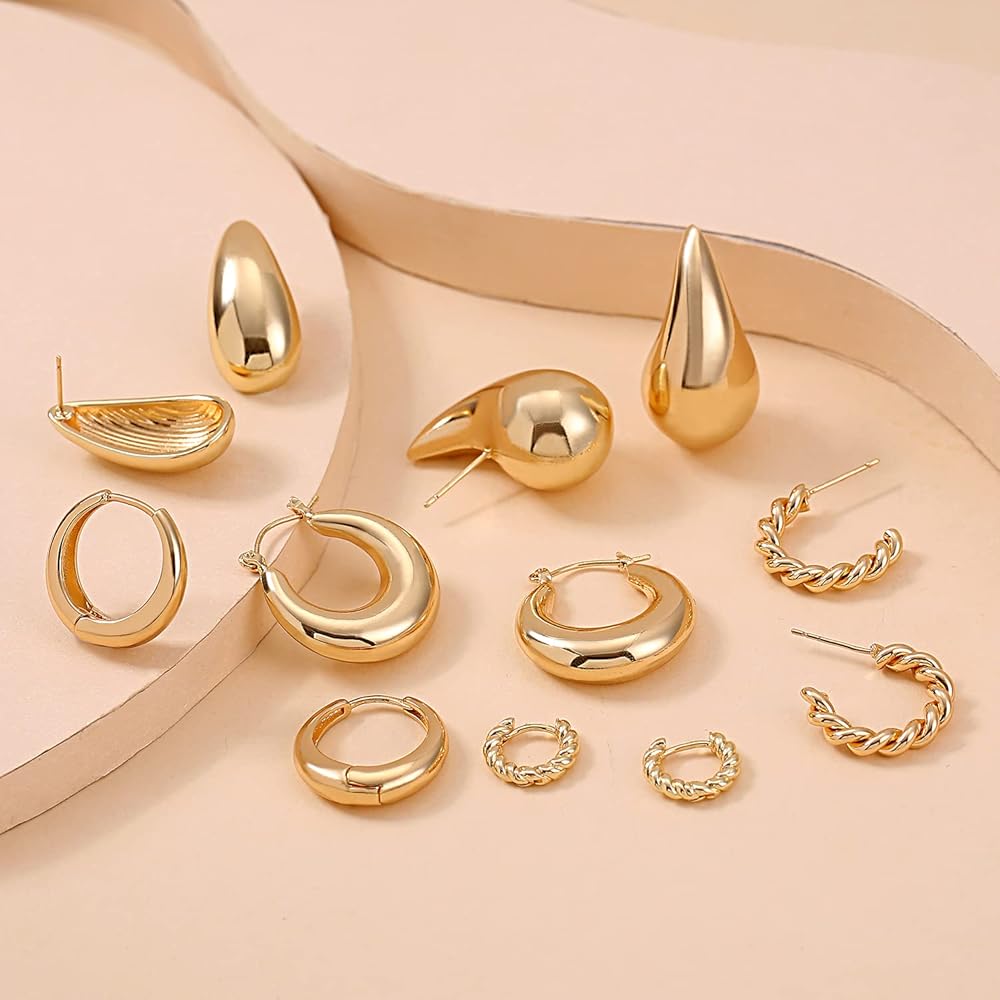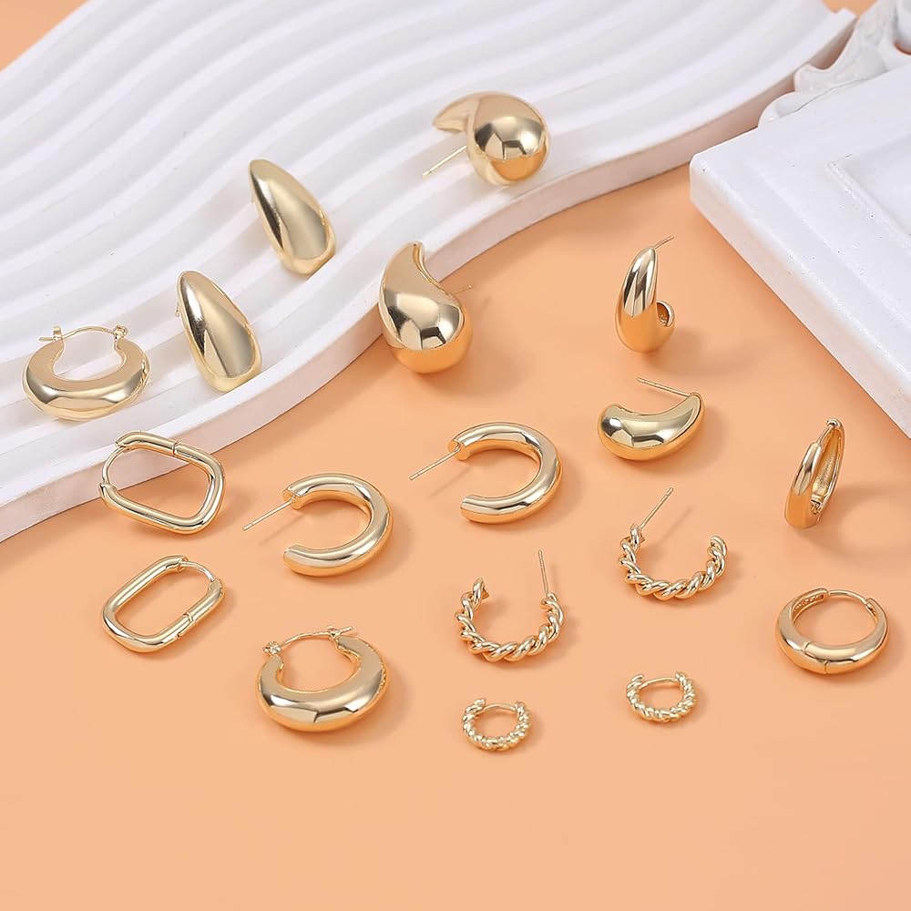 مجموعة الأقراط الذهبية: سوف تحصل على 9 أزواج من الأقراط الذهبية المكتنزة بأشكال مختلفة. تحظى أنماط الأقراط الذهبية هذه بشعبية كبيرة وتمثل عنصر الموضة الحالي.