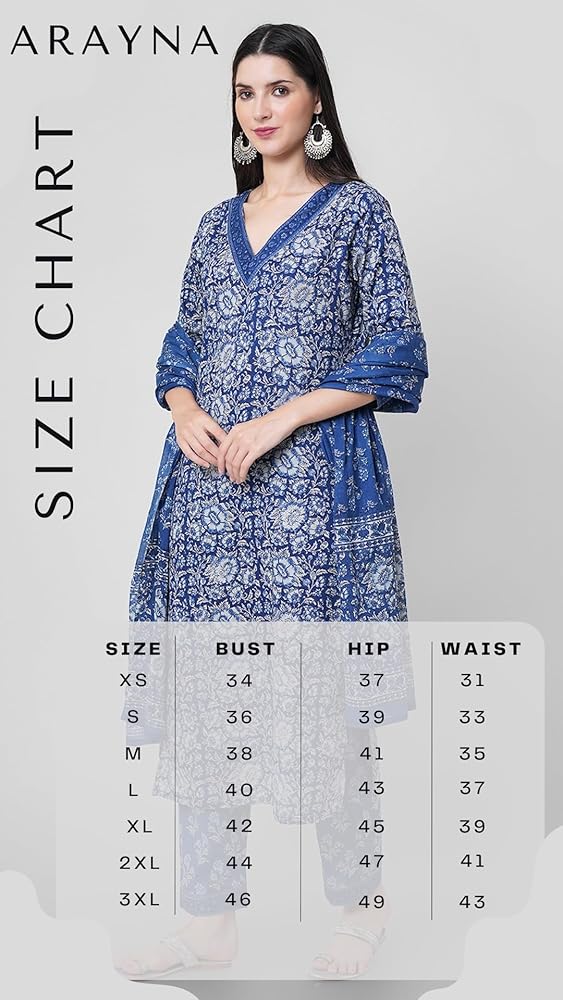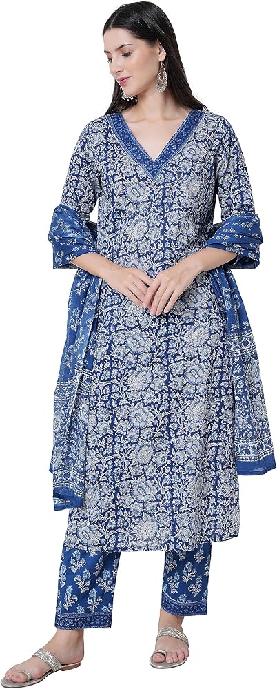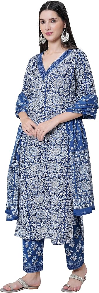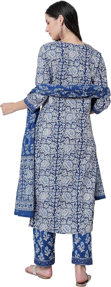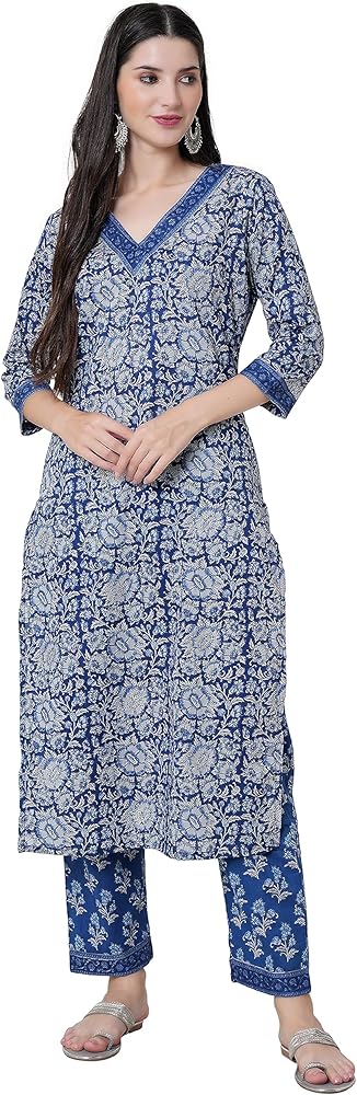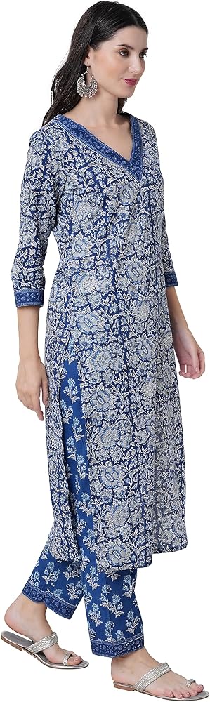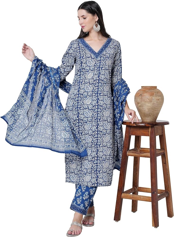 مجموعة كورتا قطنية مستقيمة للسيدات مع دوباتا وسروال بالازو، كورتي أزرق مطبوع عليه زهور