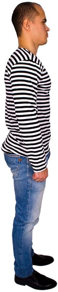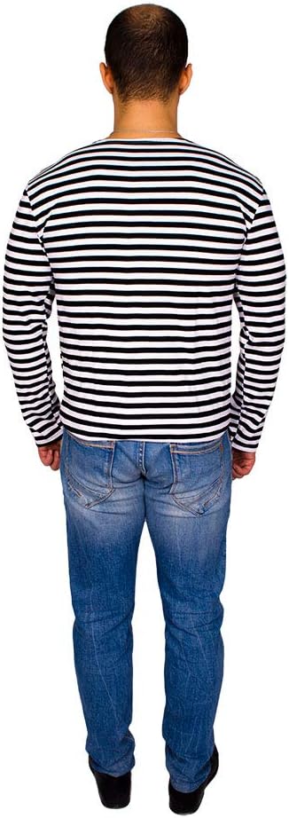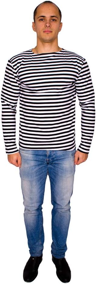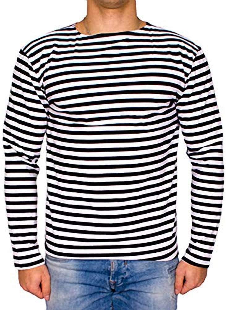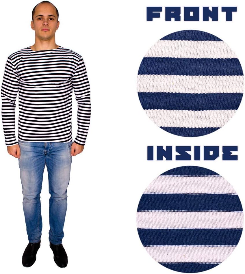 - Genuine navy blue striped long-sleeved t-shirt. 100% 240g/cm Cotton. These are of a very high quality, not the usual lesser quality offered by others. - Fabric: Interlock is a knitted fabric made of cotton, which has several amazing properties. It is smooth on both sides, breathable, wear-resistant (little creases and quickly restores its shape after deformation), soft, durable, attractive. This fabric is absolutely natural, so it never causes allergies and even skin irritation. Made in Ukraine.