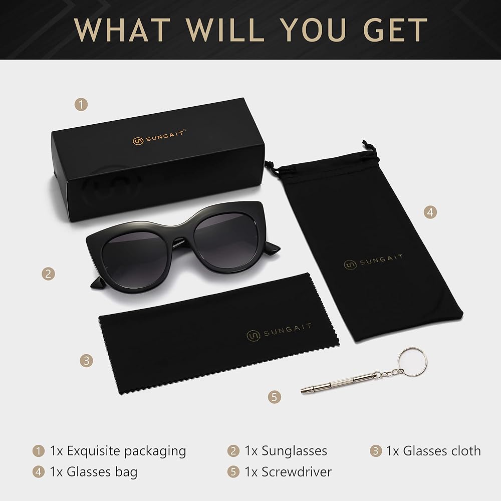 تصميم أنيق - نظارات شمسية كلاسيكية دائرية للسيدات وتصميم ملون جميل يجعلك تبدو أنيقًا للغاية. النظارات الشمسية النسائية ذات الإطار الدائري من SUNGAIT لا توفر المزيد من الحماية من الأشعة فوق البنفسجية لعينيك فحسب، بل تتيح لك أيضًا أن تبدو أكثر غموضًا وسحرًا.