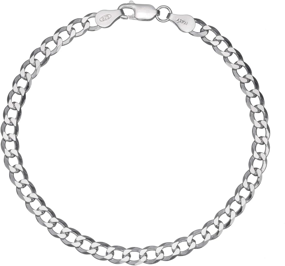 This masculine, heavy duty curb chain bracelet is very durable, yet lightweight and comfortable to wear. It's a flat chain that measures approximately 1.2mm thick and 4.5mm wide, and is made in Italy with the finest standards of craftsmanship, using only solid 925 genuine sterling silver. It has a bright silver finish, with a diamond-cut design that catches the light. Each chain bracelet is stamped 925 and ITALY for authenticity. Our chains are imported directly from the Italian manufacturer, allowing us to offer you the lowest prices. The bracelet is secured with a heavy duty lobster claw clasp, which is more durable than the standard spring ring clasp used on other chains. Select your desired bracelet length from the drop-down list.