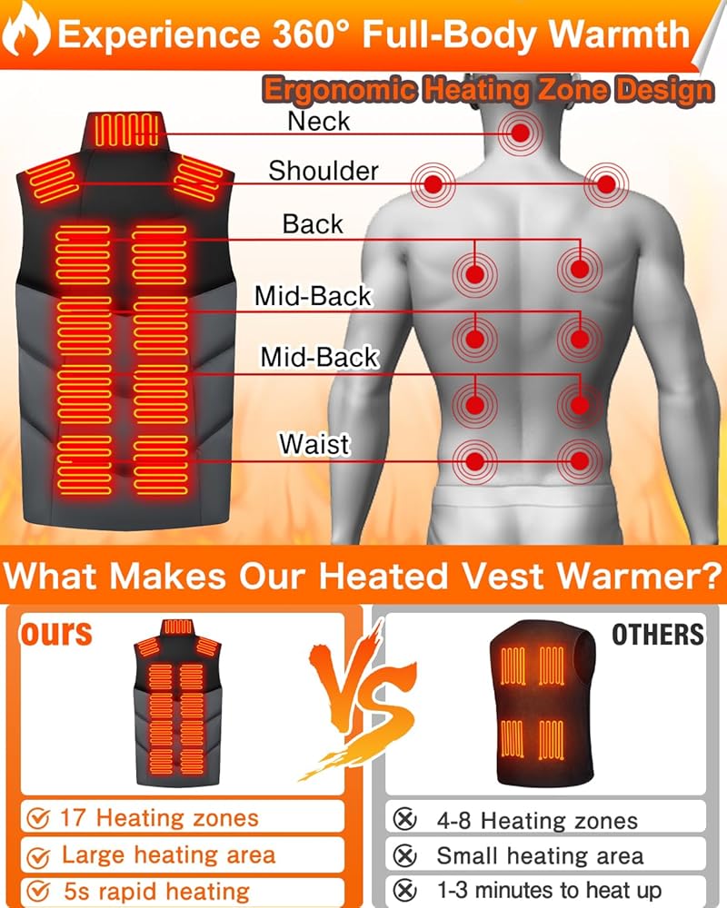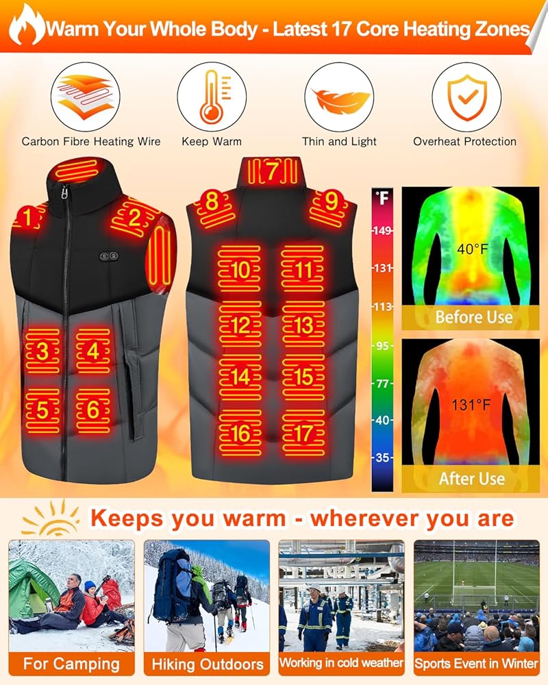 17 منطقة تسخين وتدفئة جسمك بالكامل - 17 عنصر تسخين من ألياف الكربون تولد الحرارة لـ 6 أجزاء أساسية من الجسم، بما في ذلك الرقبة والظهر والبطن والخصر وما إلى ذلك، تساعد السترة الساخنة على الحفاظ على دفء الجسم. (لا يتم تضمين بنك الطاقة)