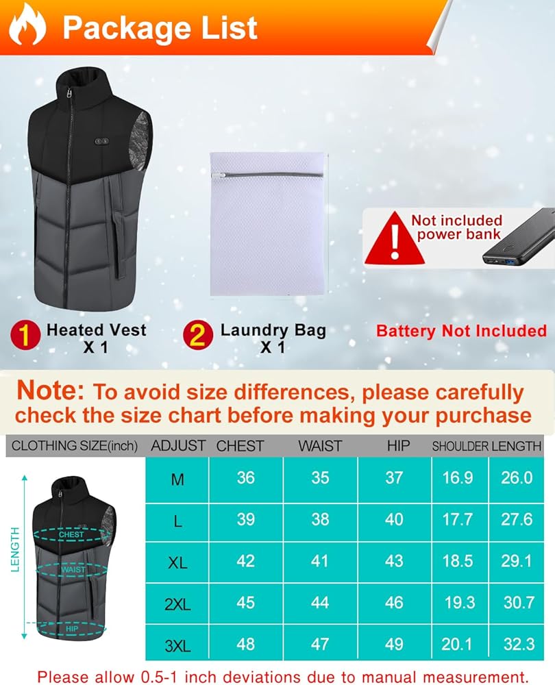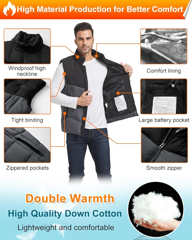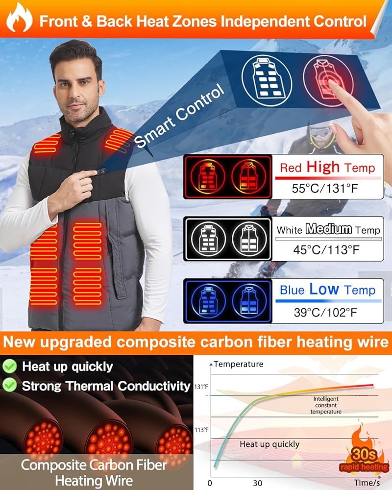 جودة عالية ولجميع المناسبات - سترة قابلة لإعادة الشحن مصنوعة من مواد عالية الجودة، والتي تتمتع بحفاظ ممتاز على الحرارة، وخفيفة الوزن، مما يمنحك أقصى قدر من الراحة. تم تصميم سترة التدفئة خصيصًا لمعظم الأشخاص مثل العاملين في الطقس البارد وغيرهم ممن يقومون بأنشطة خارجية (مثل المشي لمسافات طويلة وركوب الدراجات والصيد ومباراة كرة القدم والتزلج وغيرها من الرياضات الشتوية).
