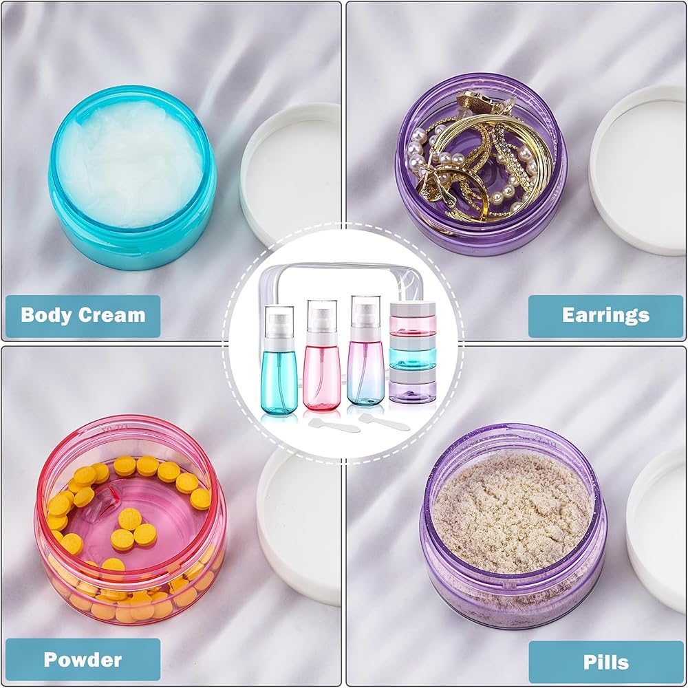 حاويات أدوات الزينة الخاصة بالسفر: بدءًا من بخاخ الوجه والكريمات وغيرها من مستلزمات السفر، تلبي حاويات أدوات الزينة ذات الحجم المناسب للسفر جميع احتياجاتك. قم بتعبئة منتجات العناية الشخصية الأساسية الخاصة بك بسهولة، مما يجعلها رفيقك المثالي في السفر، مما يضمن حصولك على كل ما تحتاجه لرحلة مريحة.
