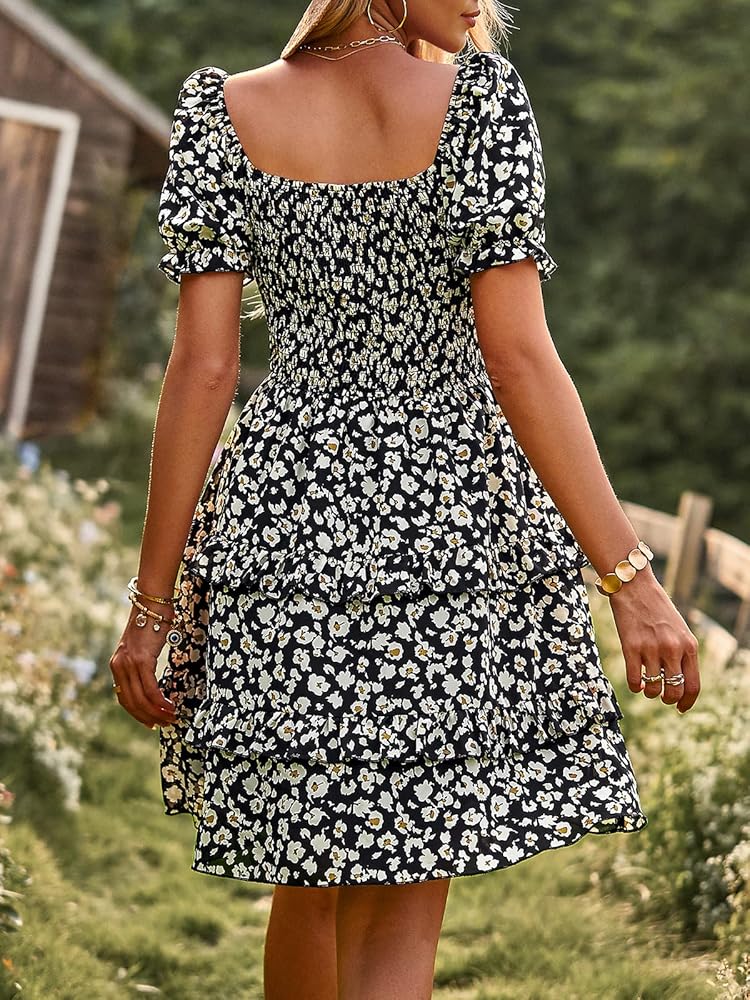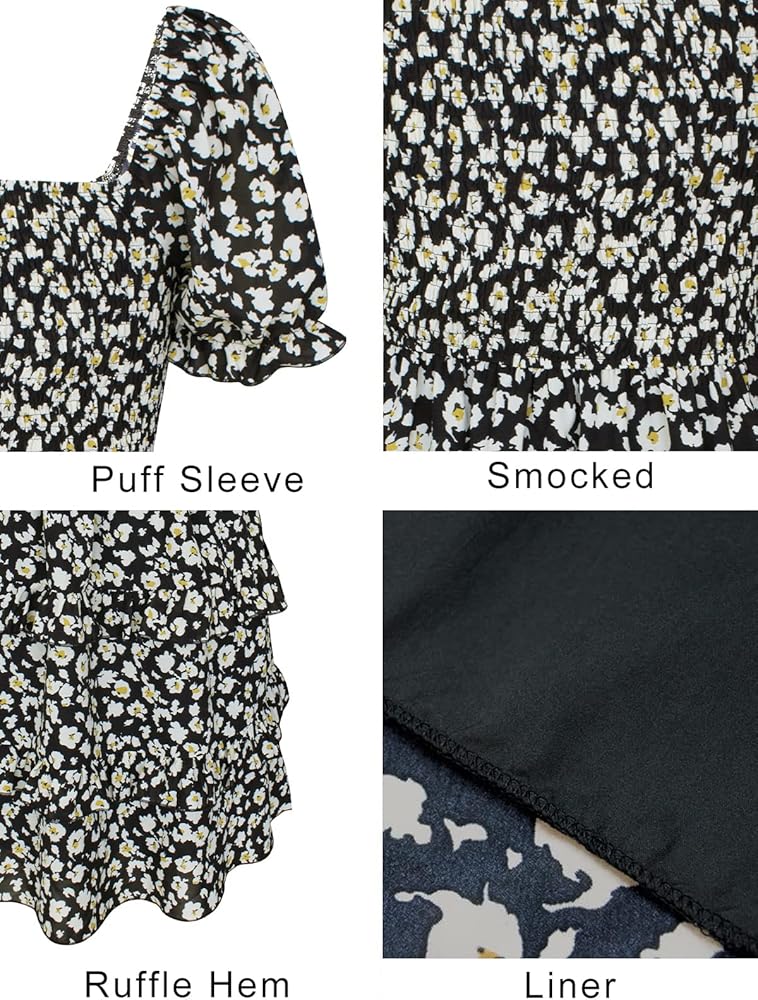 ★التصميم: فستان نسائي للخريف والشتاء برقبة مربعة وأكمام طويلة، تصميم بدون أكتاف، حاشية واسعة مكشكشة، فستان بطباعة زهور بوهو بشكل عام، طول الركبة صغير، صدر مكشكش، خصر مرتفع، صورة ظلية على شكل حرف A.