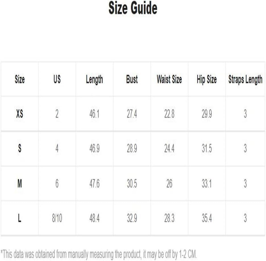 Small: Length: 46.9", Bust: 28.9", Waist Size: 24.4", Hip Size: 31.5", Straps Length: 3.0"