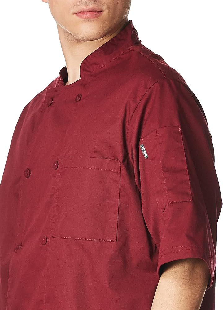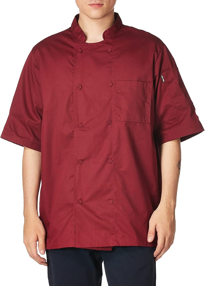 Short sleeve chef coat featuring a mesh, upper back panel to keep things cool and ventilated in the kitchen. Double breasted 60/40 poly-cotton made with fabric-covered buttons, French cuffs, thermometer and left inset pockets.