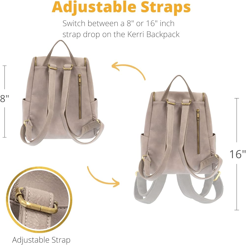 The Kerri vegan leather small backpack purse for women is one of our roomiest backpack purse we've made, with tons of space for everything you just can't leave home without. Unzip the front flap all the way down for easy access, use the side pockets for items that you'll need on the fly, and use the back zipper pocket to stash your cash, IDs, and anything else that needs extra protection. Small enough for cute teenage purses yet roomy enough for anything the day throws at you.