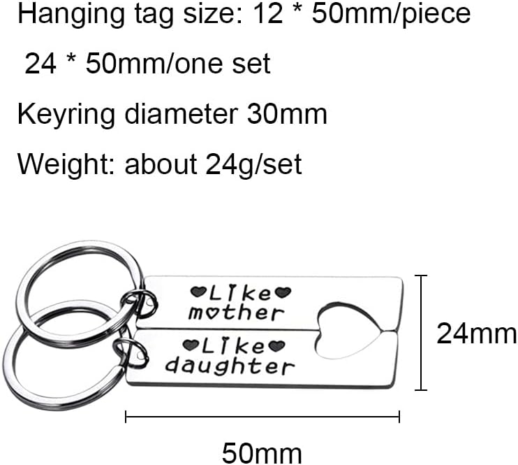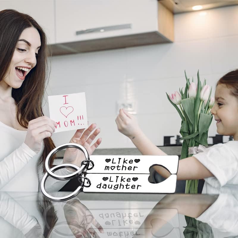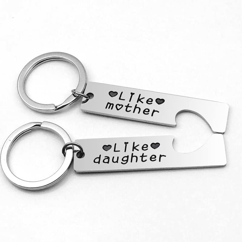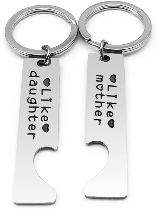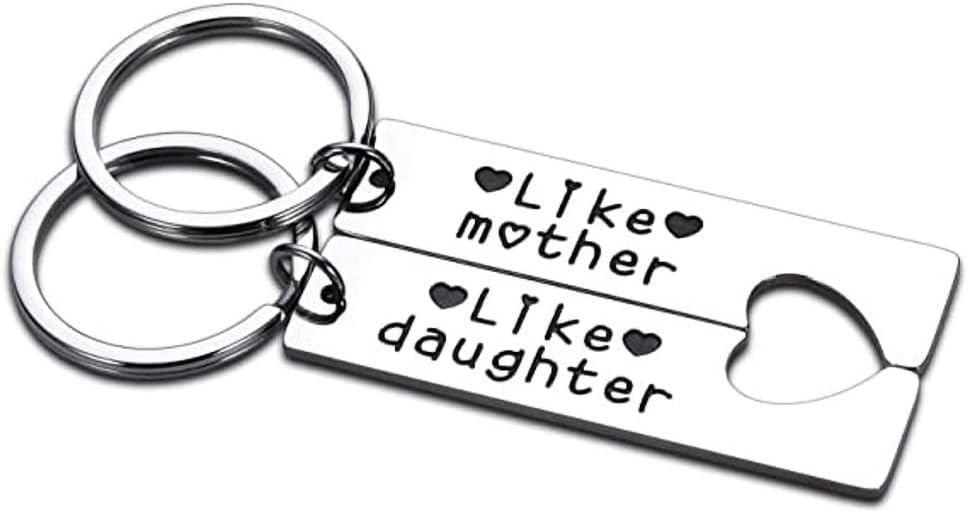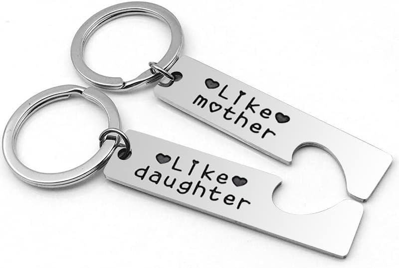سلسلة مفاتيح مطابقة للأم والابنة منقوشة بعبارة "Like mother" و "Like daughter"، غالبًا ما يُقال هذا المصطلح عندما تأخذ الابنة والدتها من حيث السلوكيات والاهتمامات والسلوك وما إلى ذلك. هدايا للأم والابنة للنساء لمشاركة سلاسل المفاتيح المطابقة