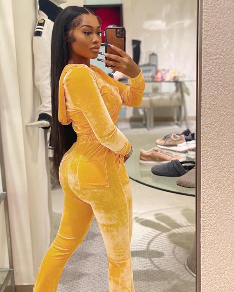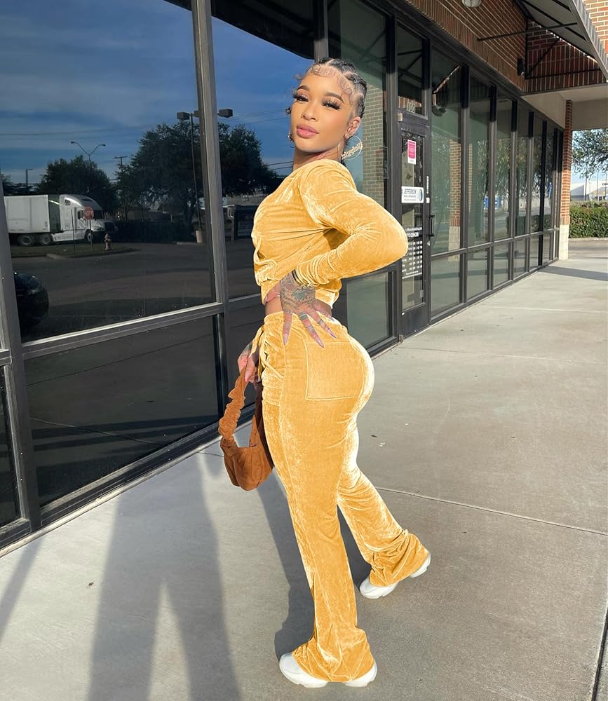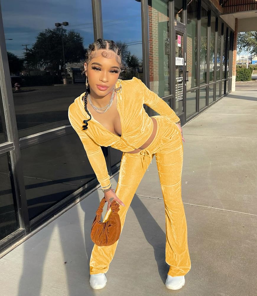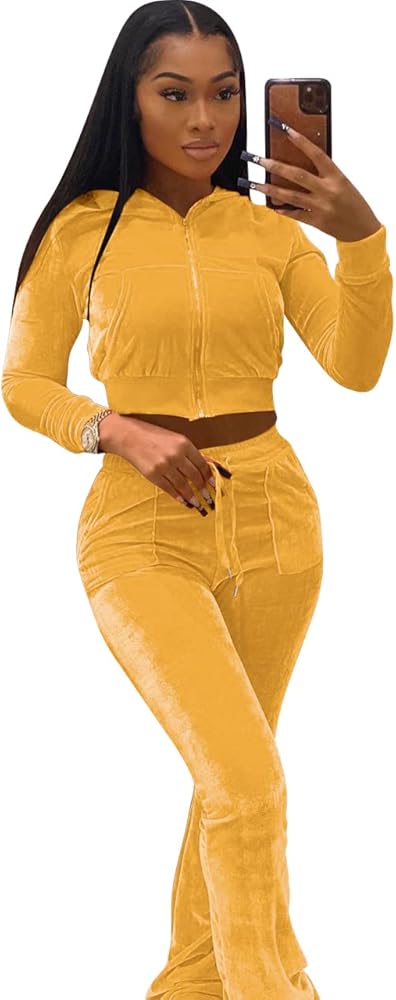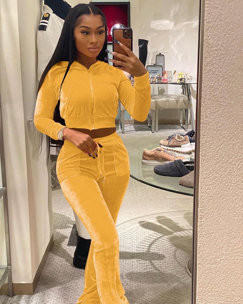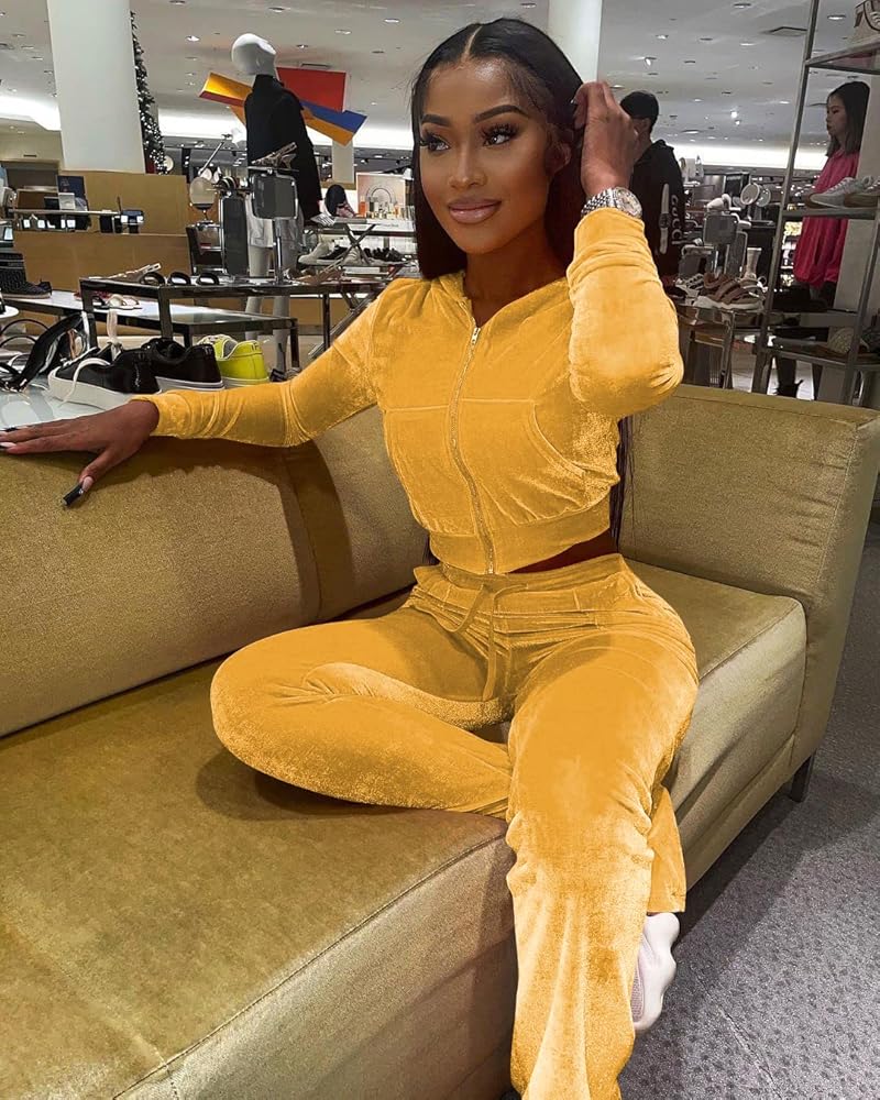 Womens velour tracksuit set include : 1 * solid color zip hoodie up crop top, 1*solid color long elastic sweatsuit pants.