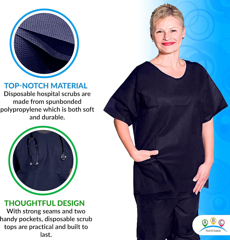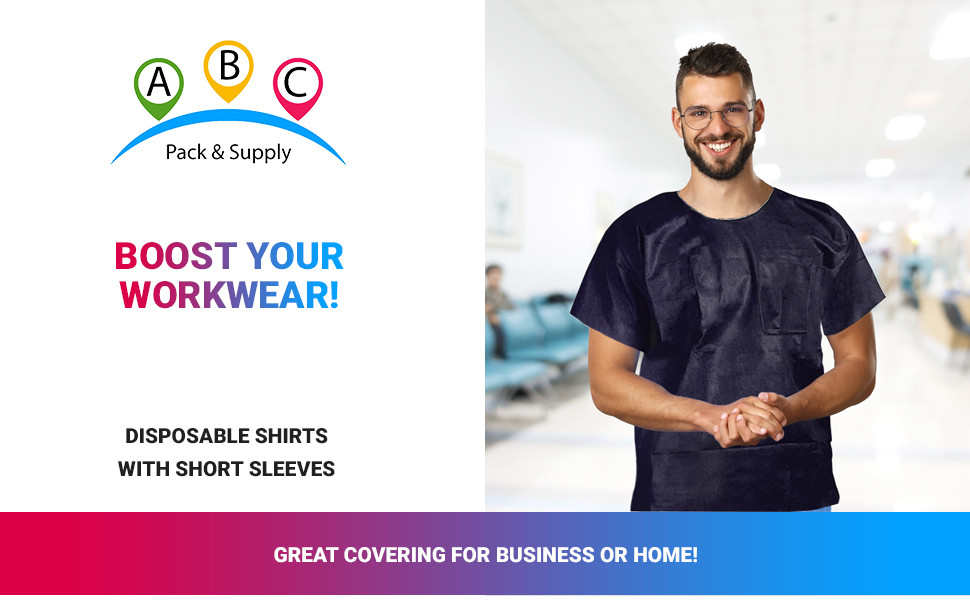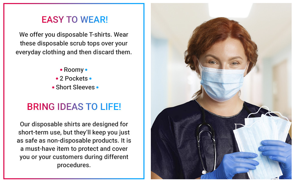 APPLICATION: Unisex disposable shirts can serve as scrub shirts and used in workplaces where non-hazardous contaminants may be present, in medical, industrial, laboratory, electronic environments.