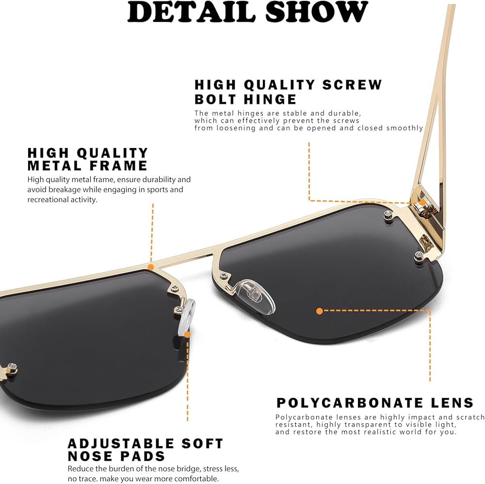 • HIGH QUALITY MATERIALS –These large retro aviator sunglasses are made of stainless steel materials which adds lustrousness in texture, clarity in colors. soft silicone nose pads, solid metal hinges, all the details ensuring you a long time using,You will definitely feel worthwhile after touching and comparing.