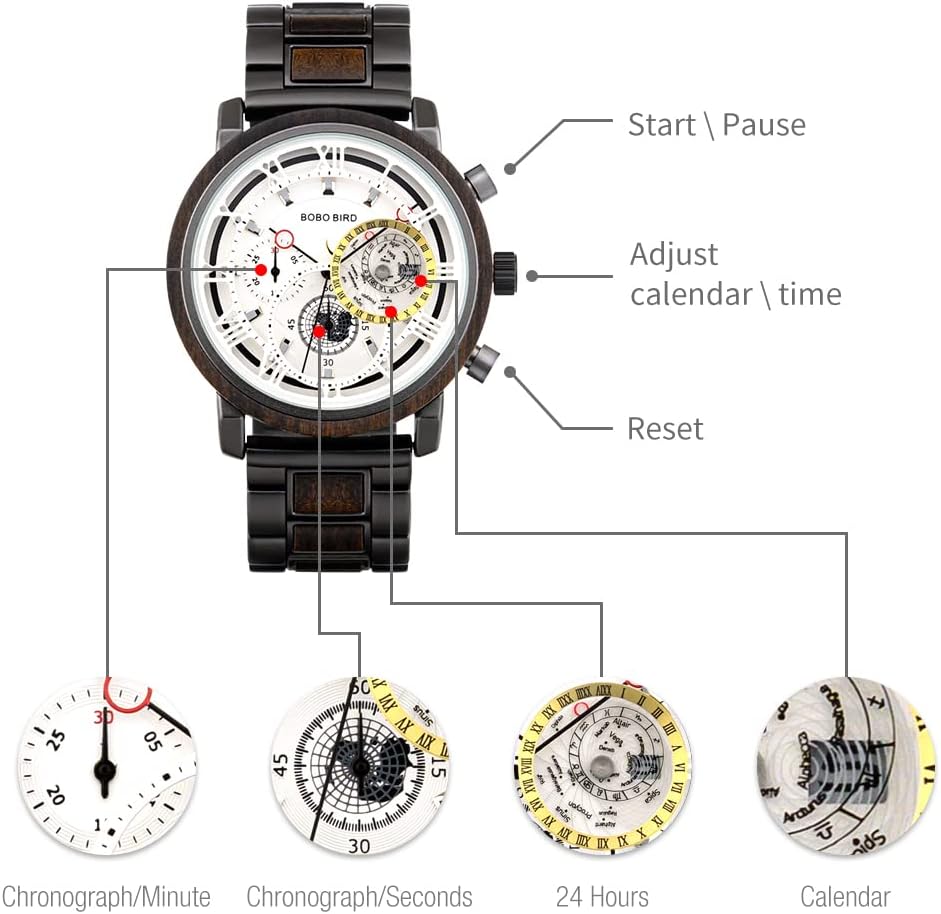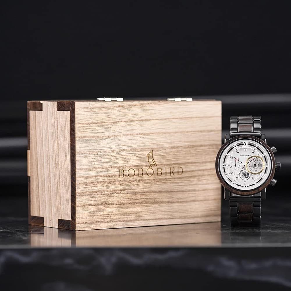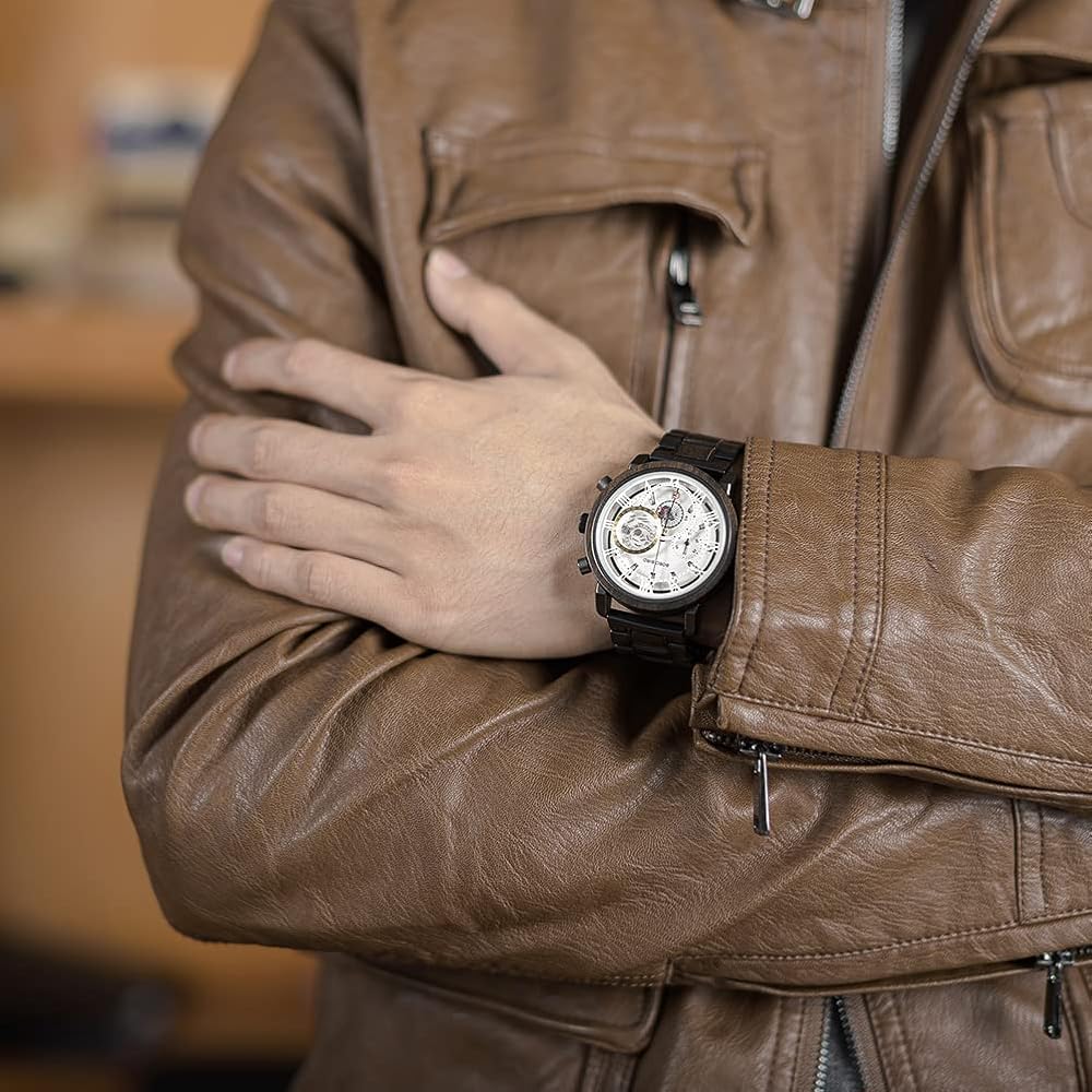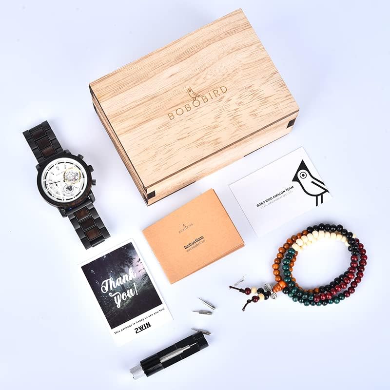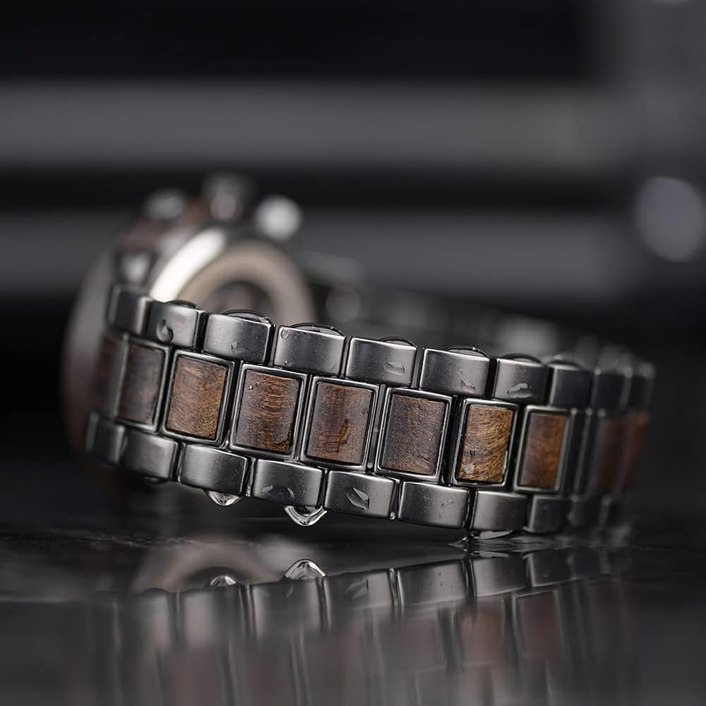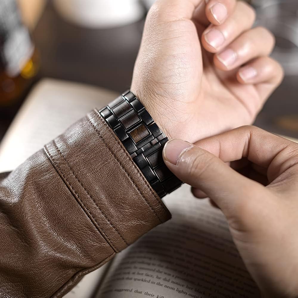 فريد/ثمين: سوار الساعة الخشبي الفريد للرجال مصنوع من خشب CHACATE PRETO الطبيعي، وهو مريح جدًا عند ارتدائه في اليد، وتأتي ساعاتنا الخشبية مع أداة إزالة لمساعدتك على إزالة الروابط الزائدة بسهولة حتى تناسب معصمك.