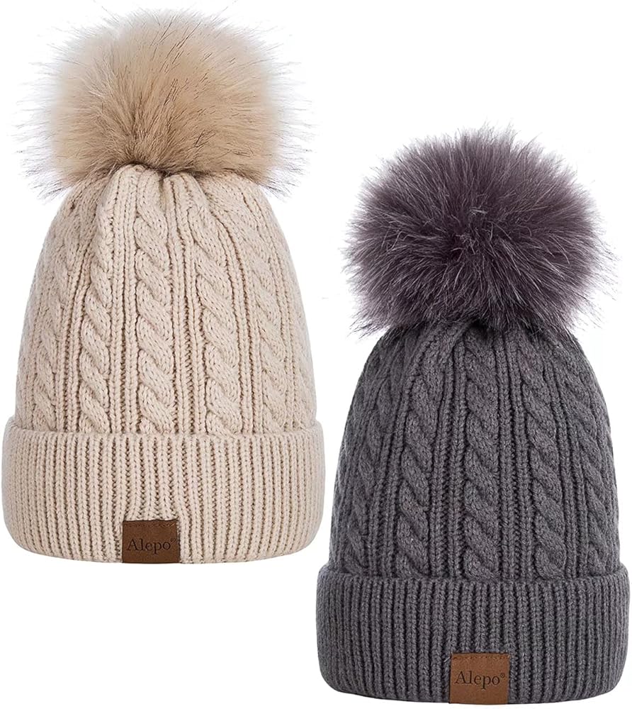 اليبو قبعات صغيرة للنساء، قبعة بوبل للنساء مع بطانة صوف محبوكة، قبعات شتوية دافئة للنساء قبعة ناعمة للتزلج مع كرات بوم بوم, One Size