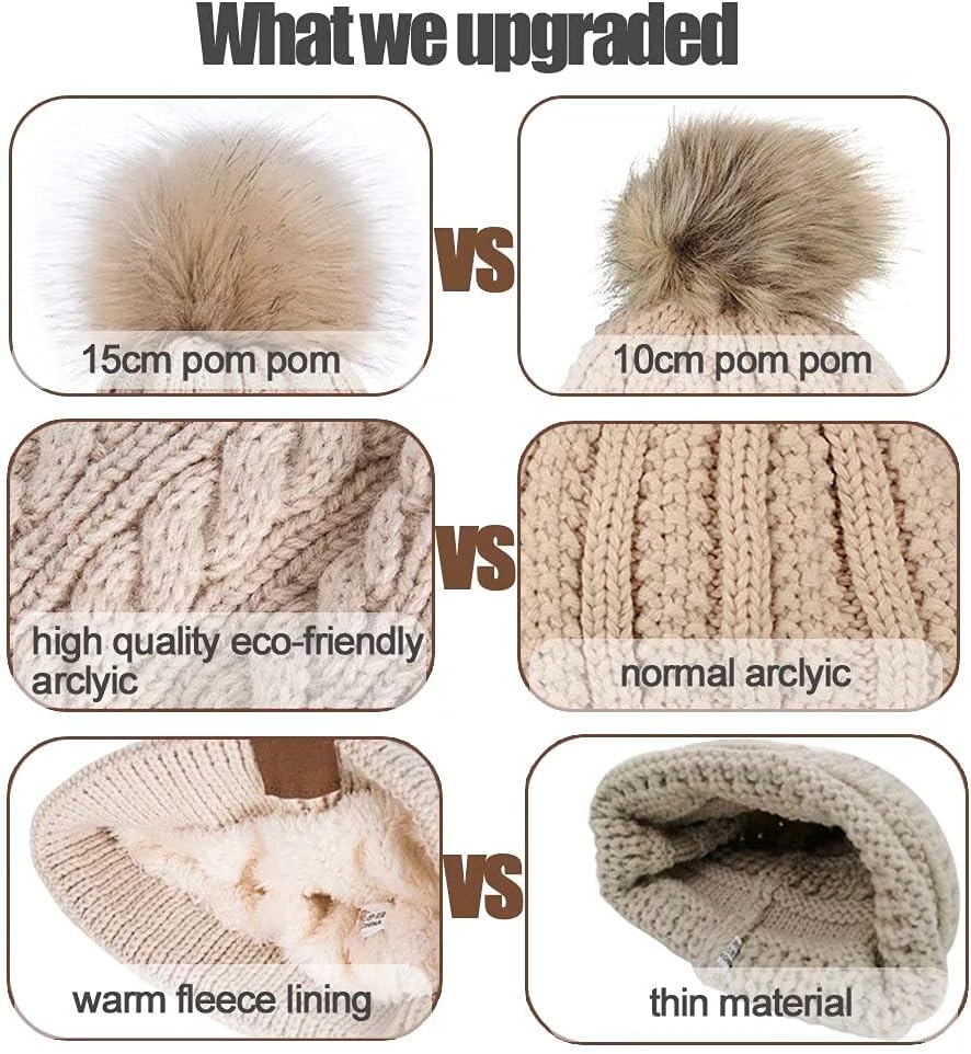 • خامة مطورة: قمنا بترقية كرات بوم بوم من 12 سم إلى 15 سم، مظهر كبير ورائع. صُنعت هذه القبعات الواسعة الأنيقة من الأكريليك عالي الجودة بنسبة 100%، وهي أكثر متانة ونعومة وأثقل قليلاً من الأكريليك العادي، ولن تسبب تهيج بشرتك أبدًا.