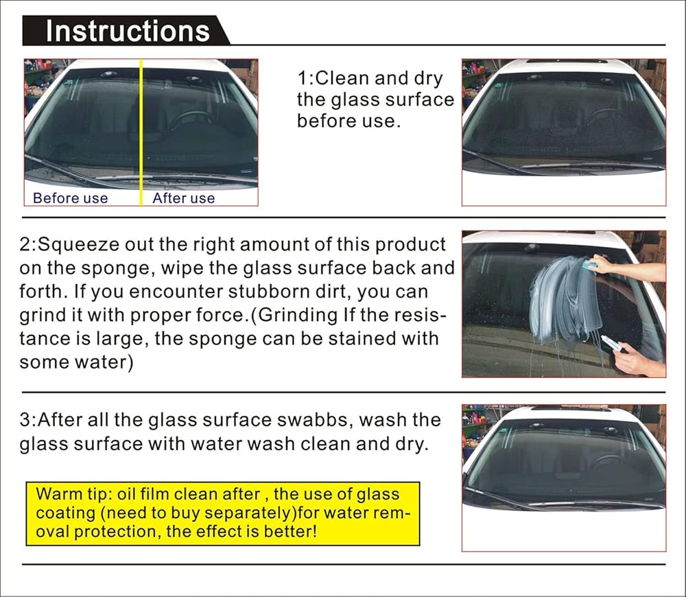 【سهل الاستخدام】اغسل الرمال المكسورة والغبار على سطح الزجاج بالماء، ضعي منظف طبقة الزيت على الاسفنجة المبللة، امسحها بالتساوي ذهابا وإيابا ثم اغسليها بالماء. سهل التركيب ويمكنه تنظيف السطح الزجاجي وبقع المطر وعلامات المطر وبقع المطر وبقع المطر وبقايا الطلاء الزجاجي المتنوعة.
