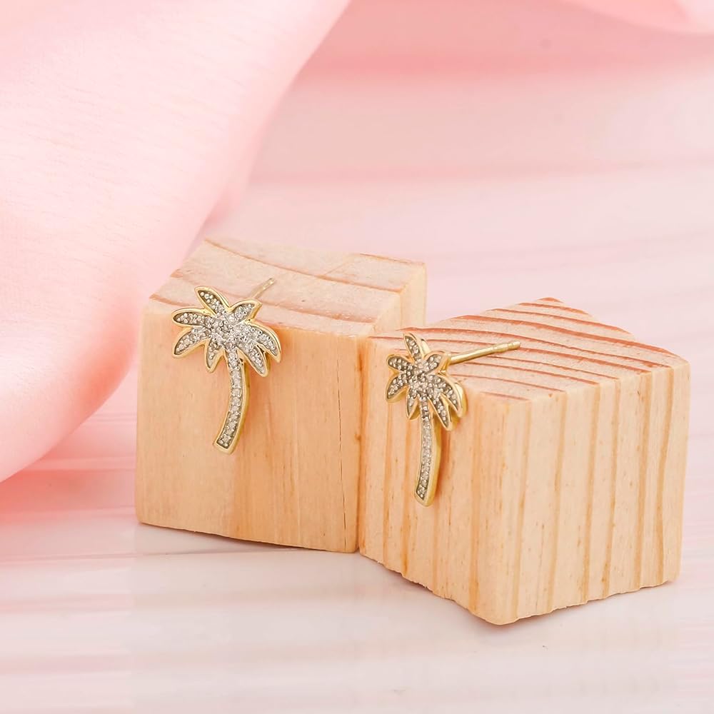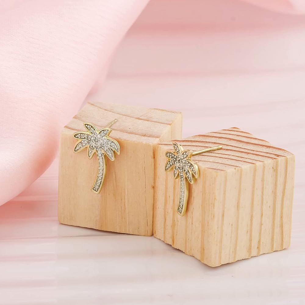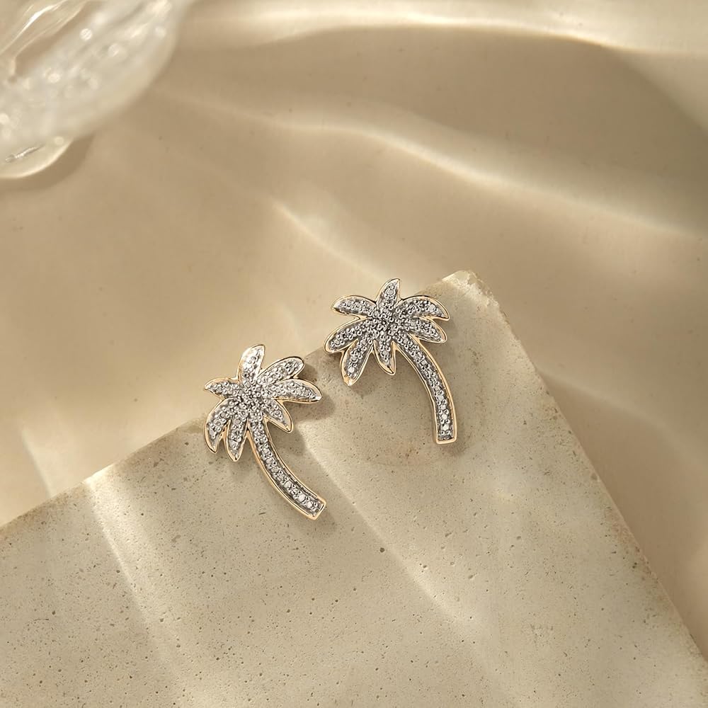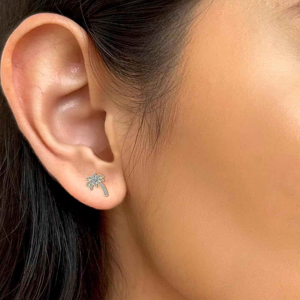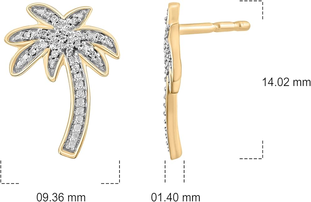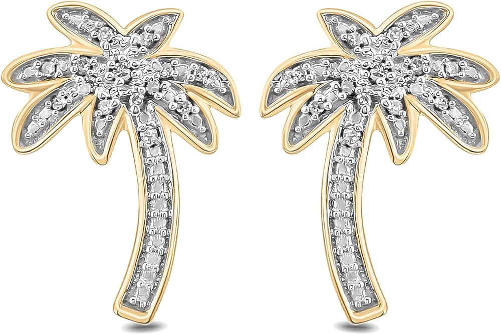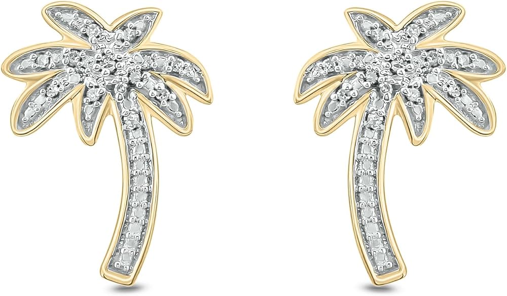 • PALM TREE EARRINGS WITH 1/20cttw DIAMONDS IN STERLING SILVER: 28 (14 each earring) Real Diamonds complete the palm tree shape of these Women's Stud Earrings. The pave-set Round White Diamonds add sparkle to this tropically themed jewelry. These small Palm Tree Earrings are available in 925 Sterling Silver and have post and push or butterfly backs. Total Diamond weight is 1/20ct