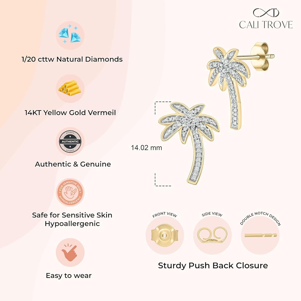 DIAMOND ACCENTED TROPICAL STUD EARRINGS: 28 (14 each earring) Real Diamonds complete the palm tree shape of these Women's Stud Earrings. The pave-set Diamonds add sparkle to this tropically themed jewelry. These small Palm Tree Earrings are available in 18k 1-Micron Yellow Gold-Plated, Rose Gold-Plated or 925 Sterling Silver and have push or butterfly backs. The 18K 1-Micron Plating over 925 Sterling Silver is good quality. Total Diamond weight is 1/20ct. An ideal present for the woman you adore - wife, daughter, mother, sister, friend or yourself. These earrings could celebrate a special occasion like a birthday, anniversary or graduation. They could also be a great way to commemorate a summer beach vacation. Cali Trove Jewelry is made with 100% Eco-Friendly Materials. Our diamonds are genuine, ethically sourced and conflict free. All our products come with a Limited Lifetime Warranty. Cali Trove is certified with RESPONSIBLE JEWELLERY COUNCIL. RJC is the leading standards authority in the global watch and jewelry industry and works with members worldwide to create a sustainable supply chain.