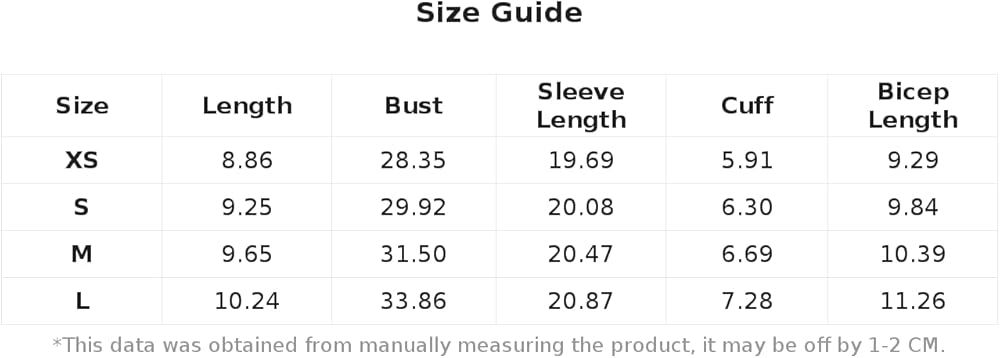 Small: Bicep Length: 9.8", Bust: 29.9", Cuff: 6.3", Length: 9.3", Sleeve Length: 20.1",