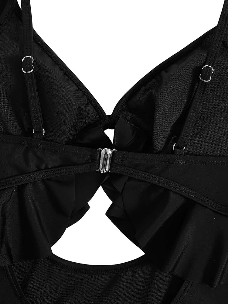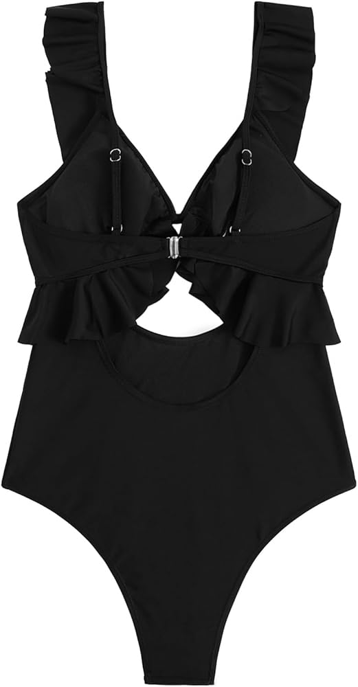 • V Neck, Adjustable Straps, Wireless Bra, Removable Padding, Ruffle Trim, High Waist, Solid One Piece Swimsuit