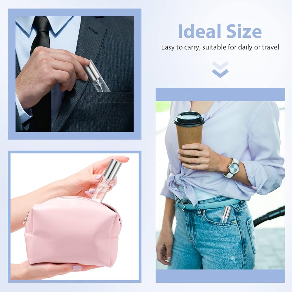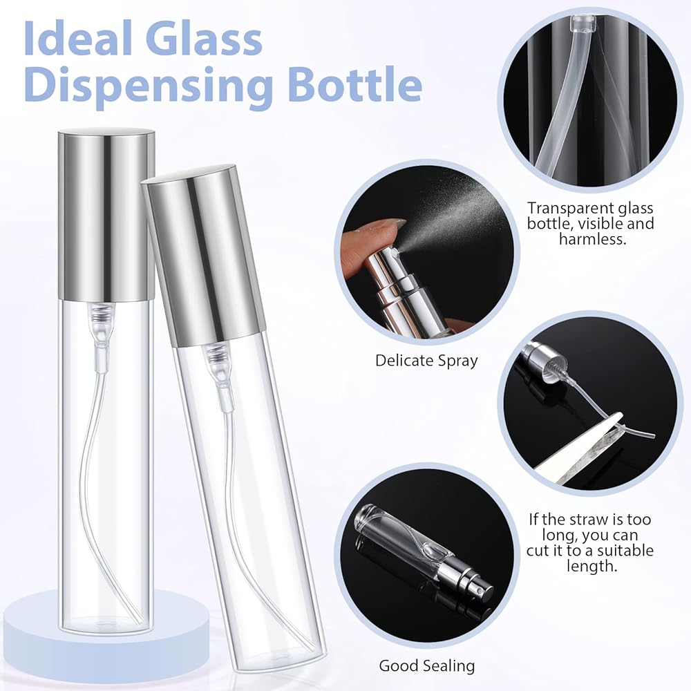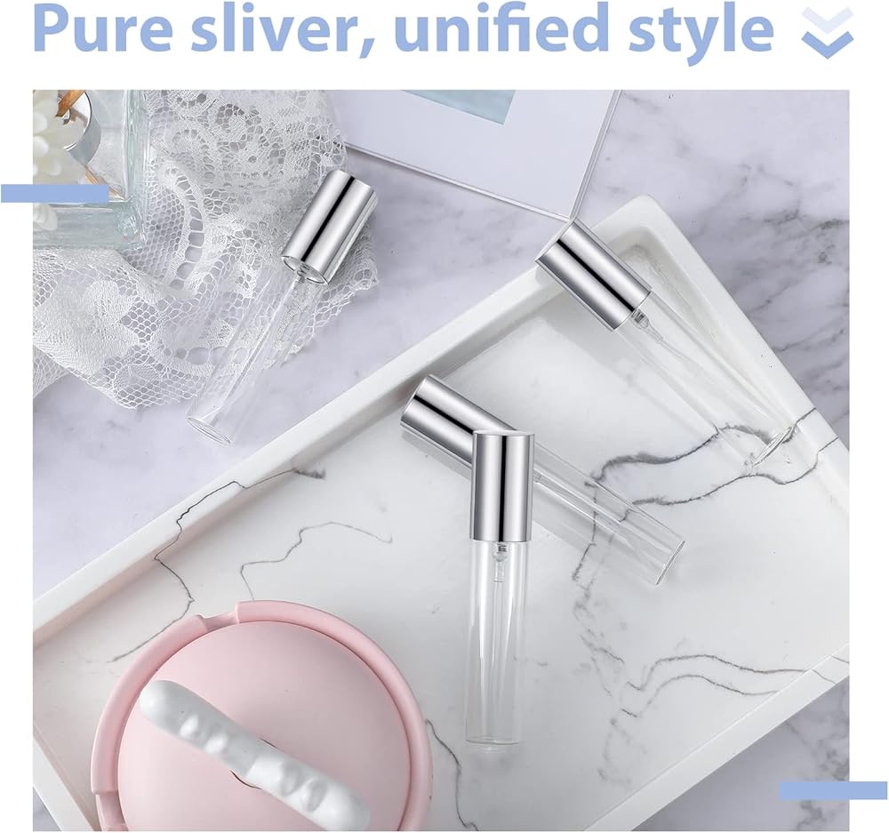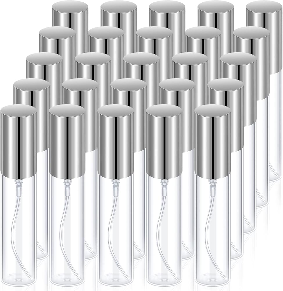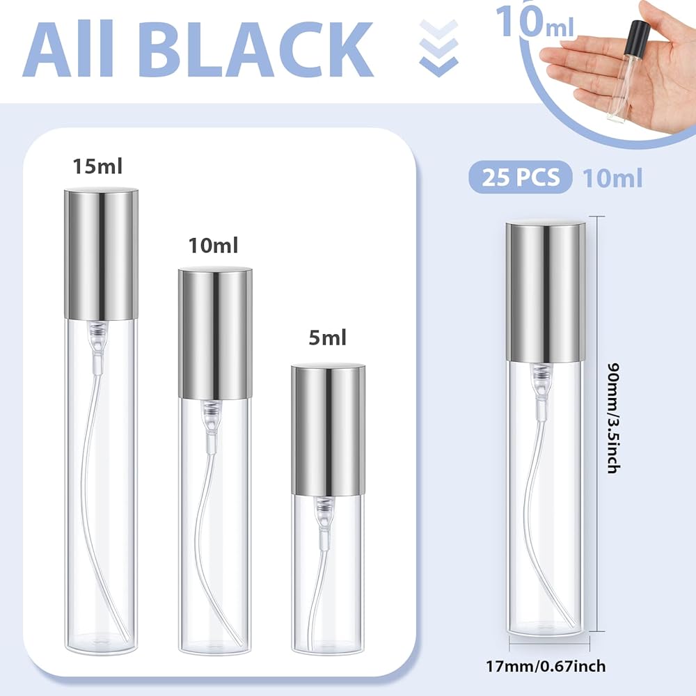 25 قطعة من زجاجات العطور المخصصة للسفر، زجاجة عطر فارغة قابلة لإعادة الملء لزجاجات رذاذ زجاجية شفافة، زجاجة عطر محمولة للسفر (فضية، 10 مل)