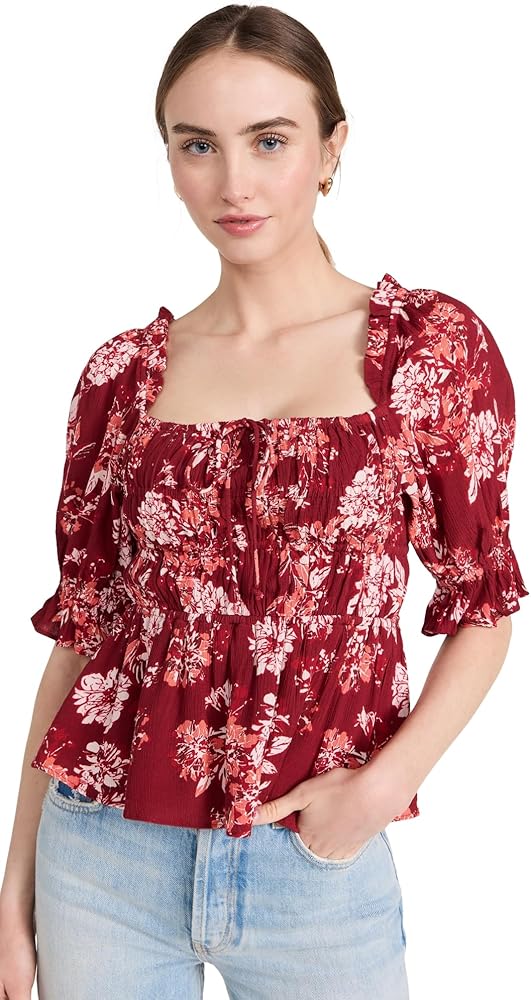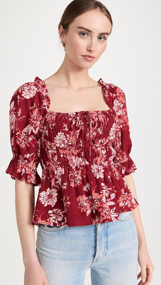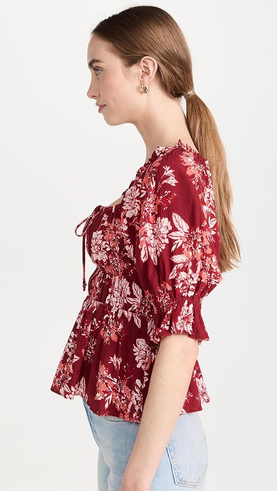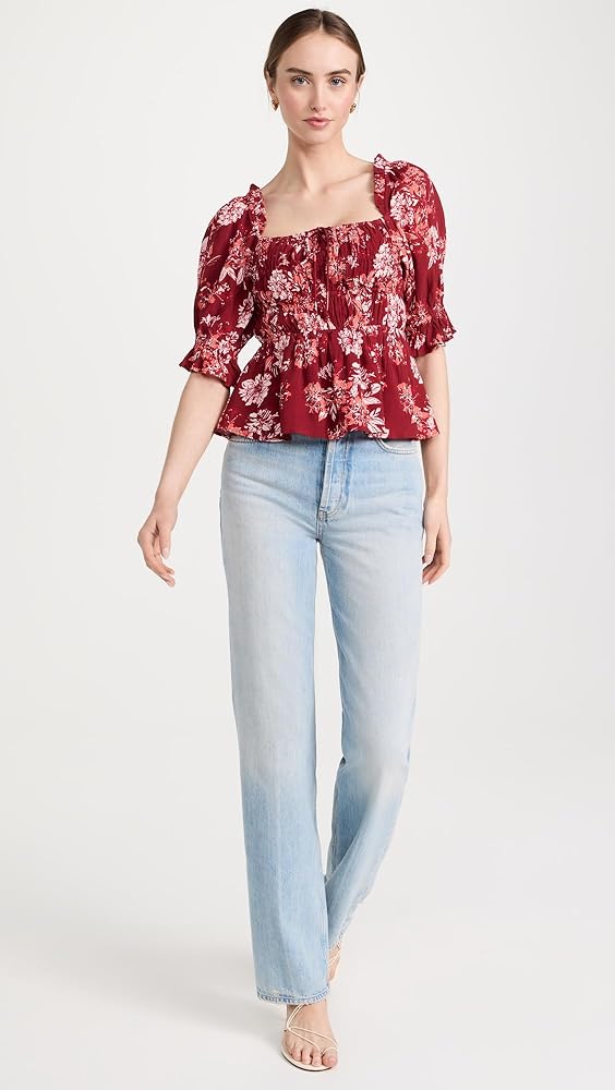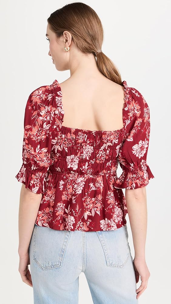 • رباط عند خط الرقبة المربع، وأكمام قصيرة منتفخة مع أطراف أكمام مرنة، وصدرية مرنة وطيات على كامل التصميم