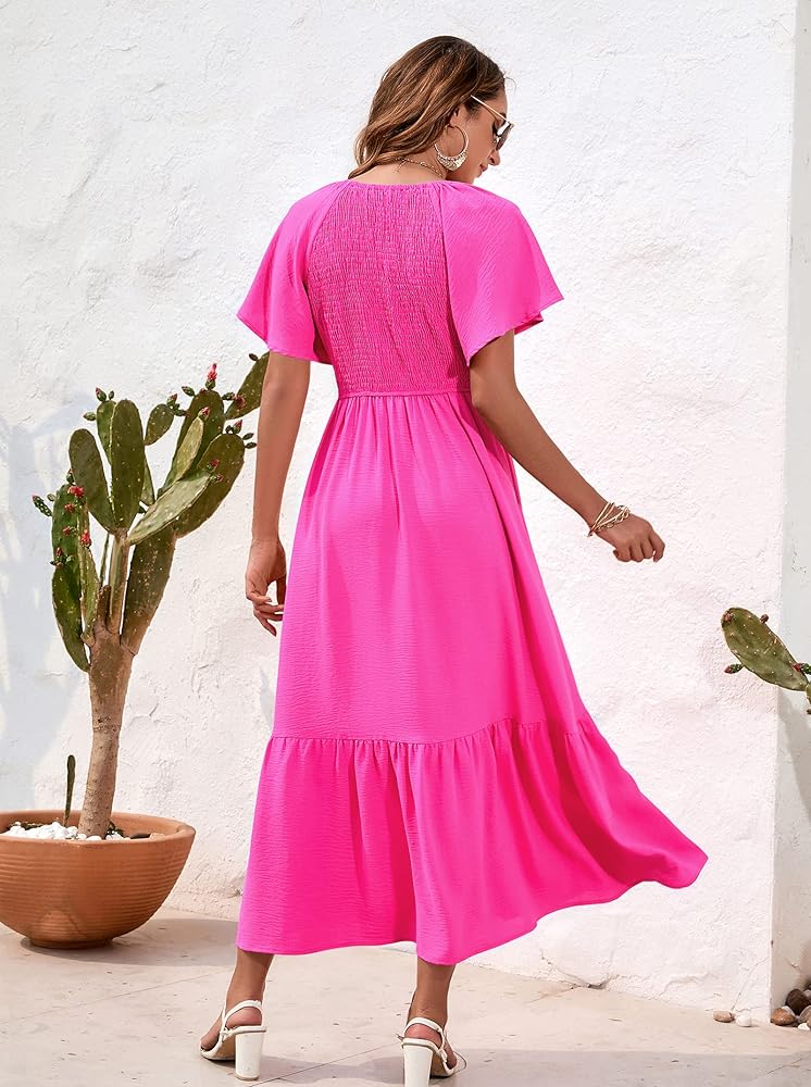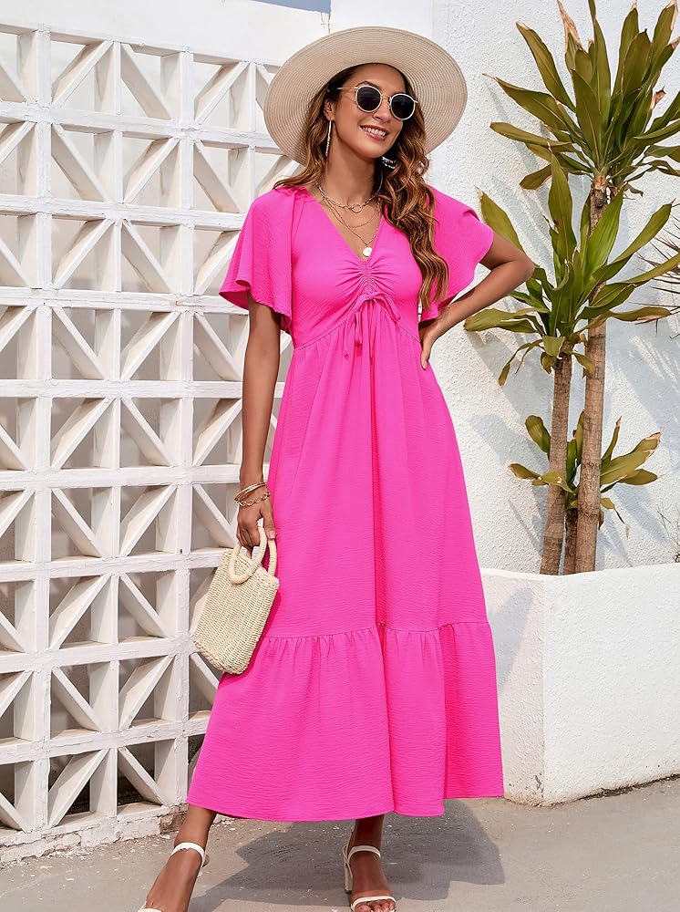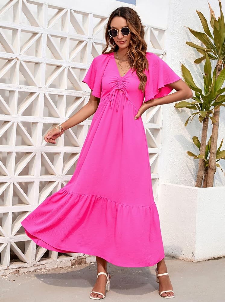 المزايا: فستان نسائي صيفي كاجوال طويل، رقبة على شكل حرف V، كم قصير مكشكش، كاجوال، رباط، مكشكش، لون موحد، فضفاض، فستان رفرف للنساء، فستان طويل متطاير بطيء للنساء
