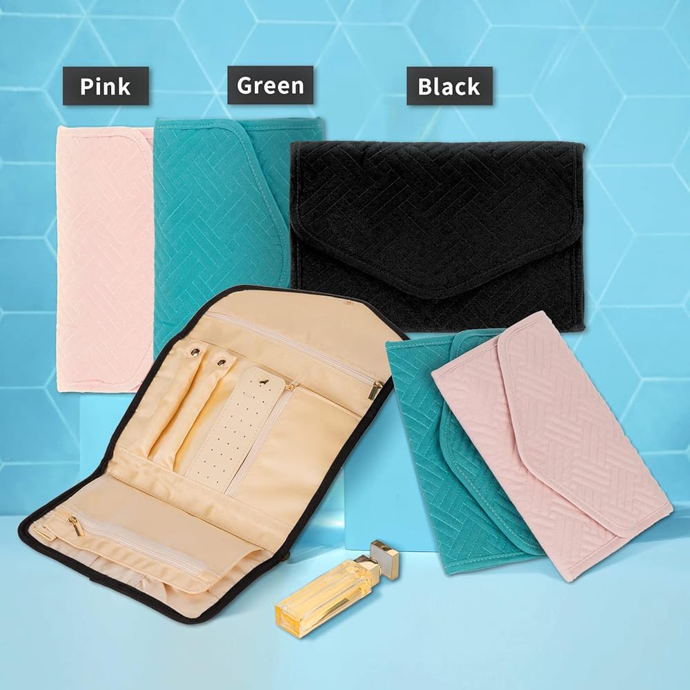 【تصميم عملي】تصميم الزر يجعل حقيبة المجوهرات ليس من السهل فتحها أثناء السفر، ويمكنها حمل المجوهرات بقوة منظمة بشكل جيد، وتأتي بثلاثة ألوان مختلفة (أسود، وردي، وأخضر)، يمكنك اختيار خيارك المفضل.