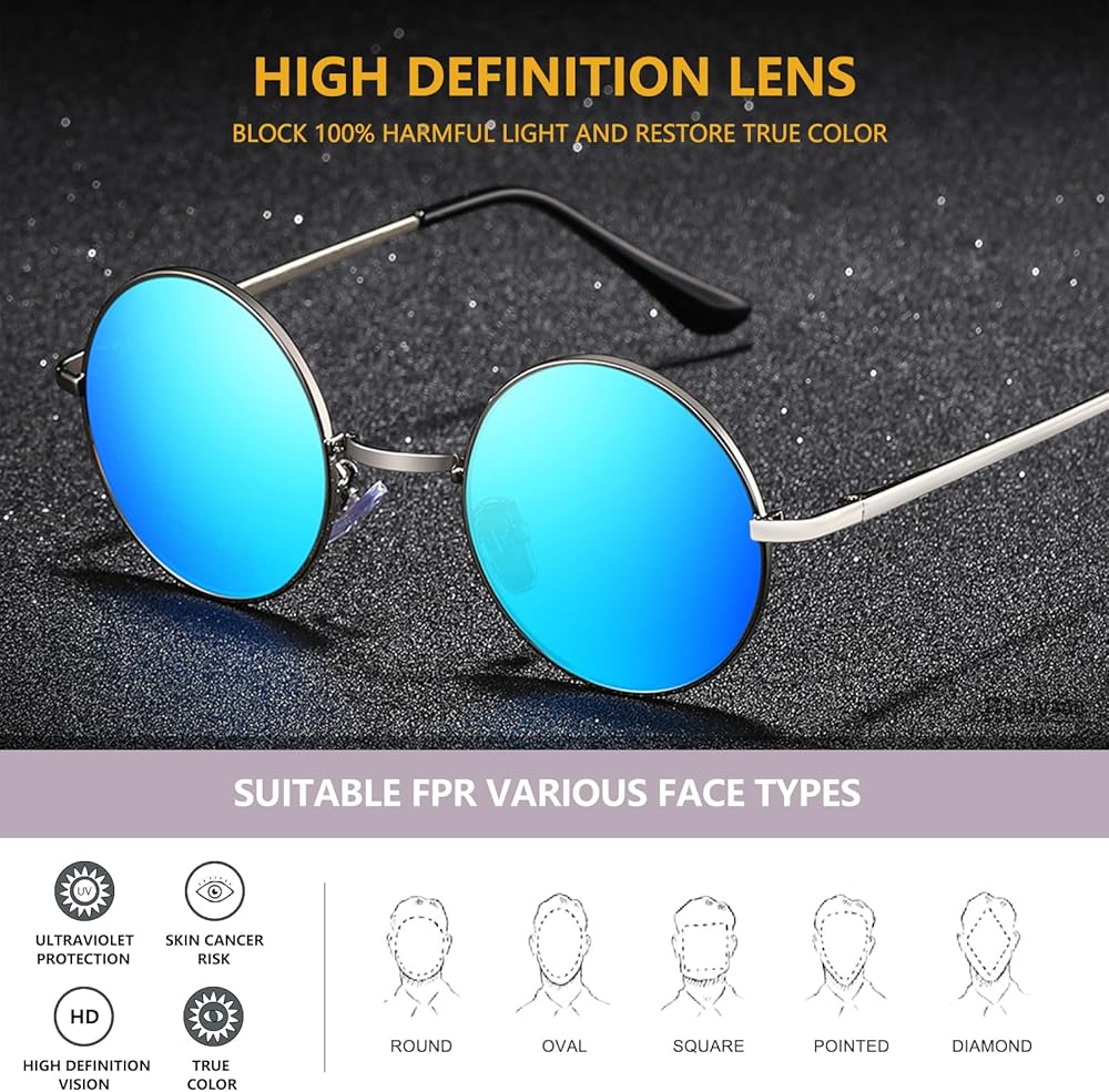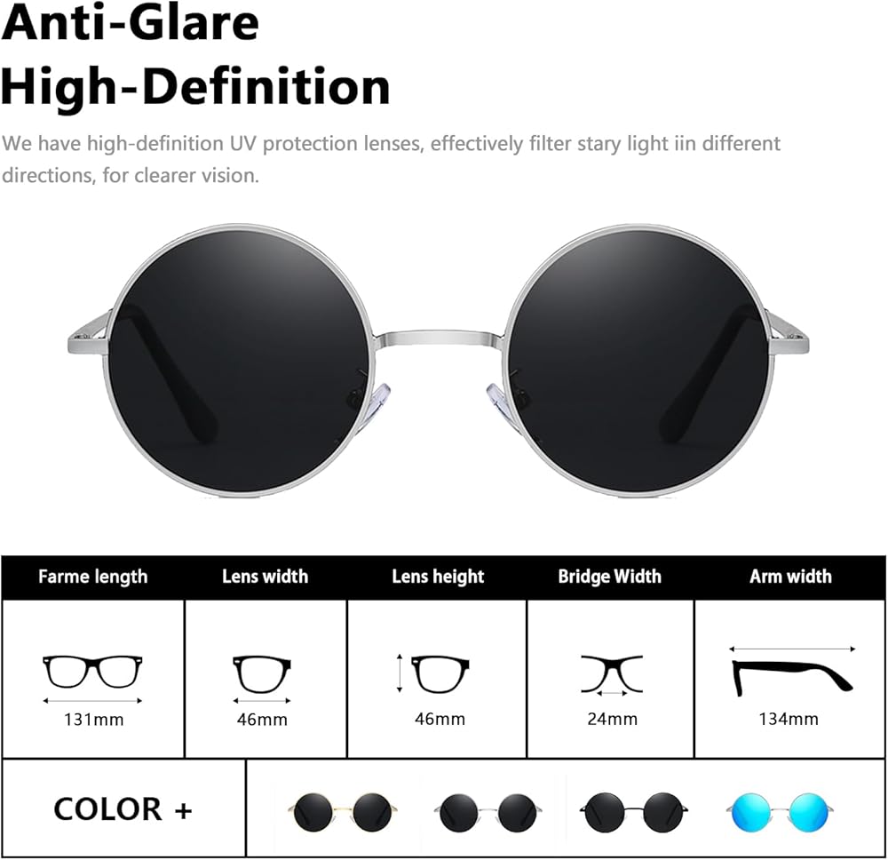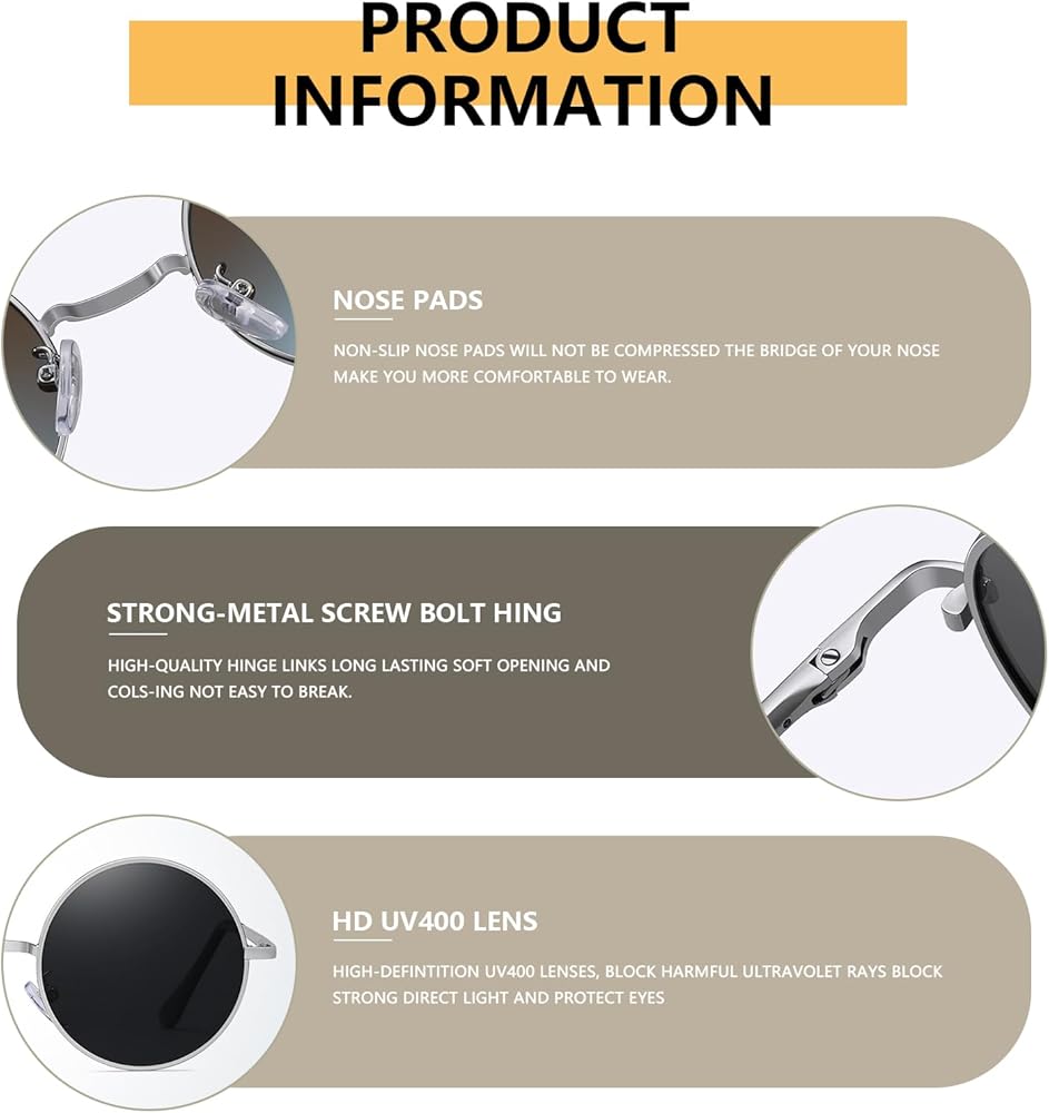• تصميم دائري قديم: استمتع بمظهر خالد وعصري مع هذه النظارات الشمسية المستديرة المستوحاة من الطراز القديم. يضيف الإطار الدائري الكلاسيكي لمسة من السحر العتيق إلى أي ملابس، مما يجعلك مميزًا بين الآخرين.