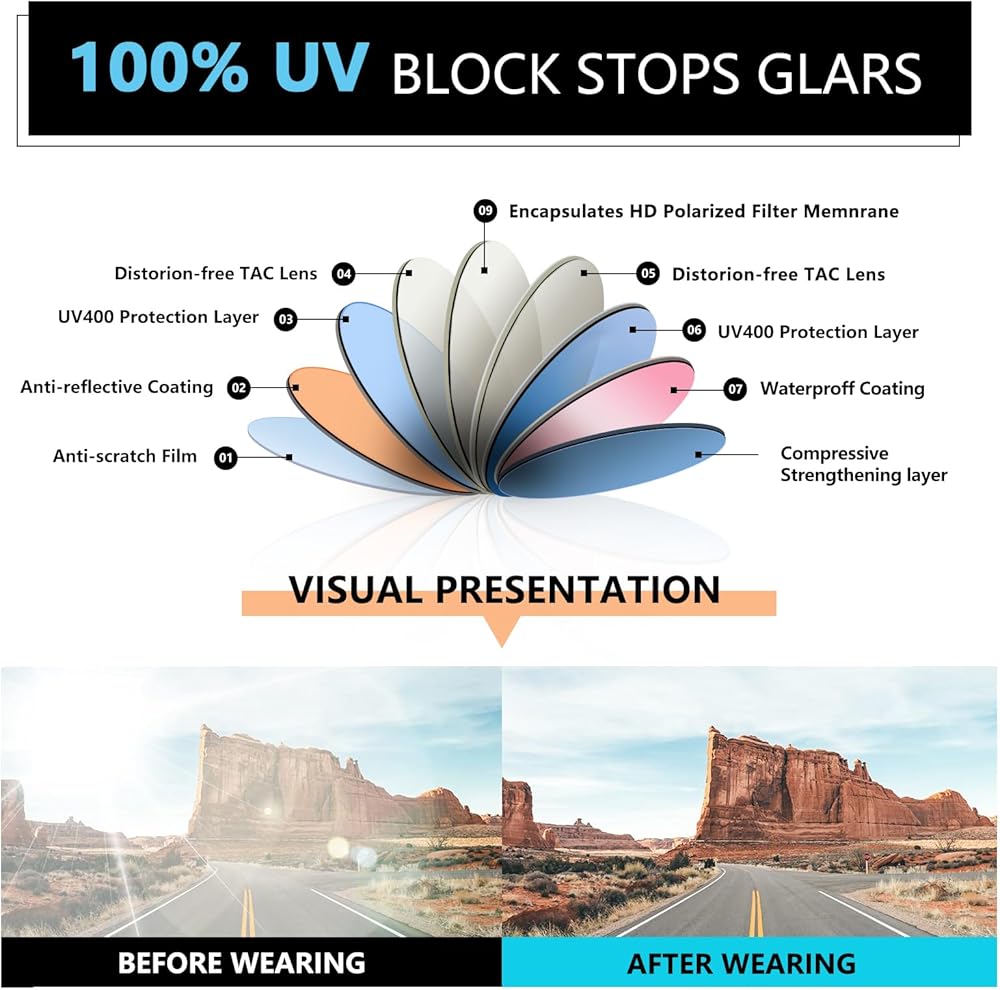• رؤية واضحة: تعمل العدسات المستقطبة على تقليل الوهج وتحسين الوضوح البصري، مما يسمح لك برؤية الأشياء بشكل أكثر دقة وراحة. سواء كنت تقود السيارة أو تتنزه سيرًا على الأقدام أو تستمتع ببساطة بيوم مشمس، فإن هذه النظارات الشمسية توفر رؤية استثنائية.