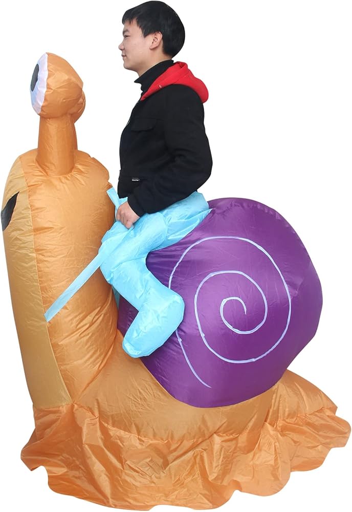 Inflatable snail costume for adults is made of strong polyester which is durable, waterproof, lightweight, well ventilated so that you can wear repeatedly without worrying about any tears or holes. One size fits most unisex adult