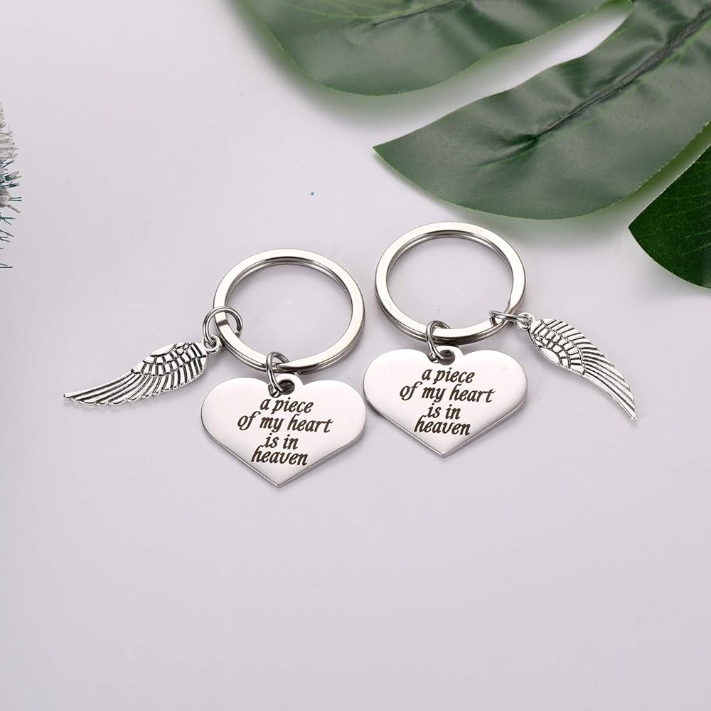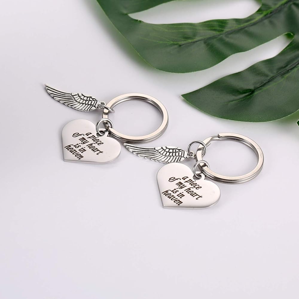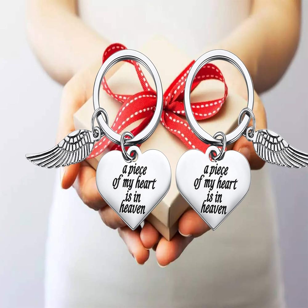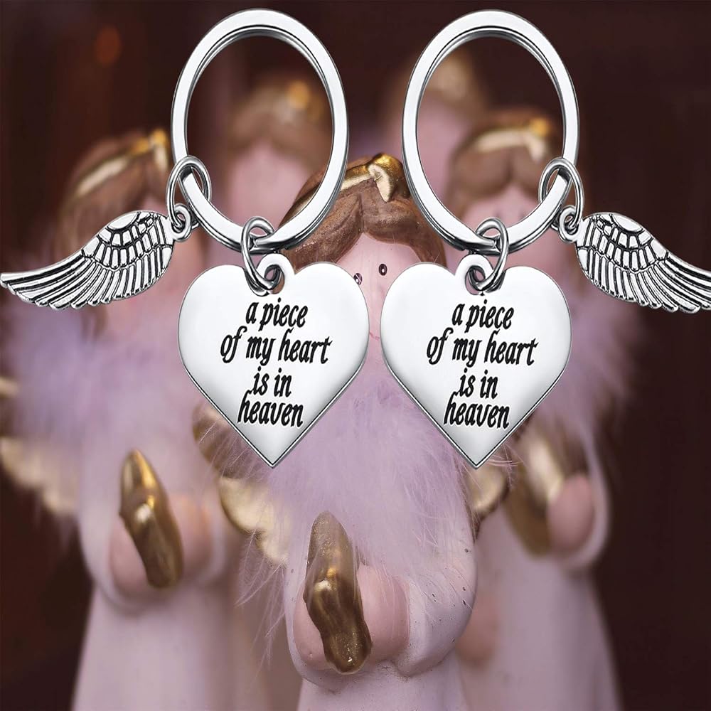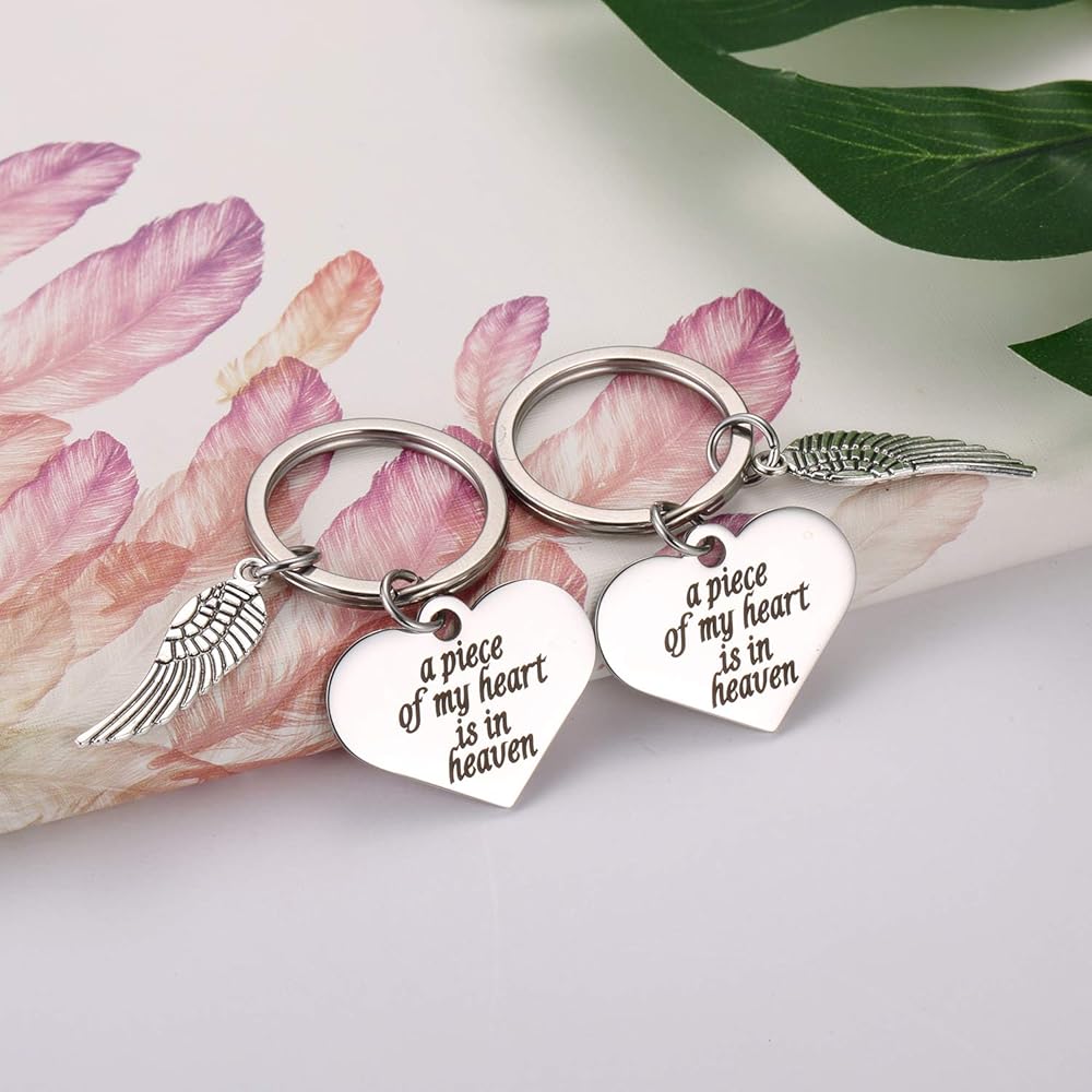 قطعتان من سلاسل المفاتيح بتصميم أجنحة الملاك - هدايا سوء النقل للنساء، سلاسل مفاتيح تذكارية للأم المفقودة، هدية بمناسبة عيد الحب «ملاك داي»، سلسلة مفاتيح منقوشة بكلمات مريحة - حلقة مفاتيح A Piece of My Heart is in Heaven وسلسلة مفاتيح أجنحة الملائكة. هدية تذكارية لراحة شخص يرخي الطفل أو العائلة أو أحد أحبائك المهمين في "يوم الملاك".
