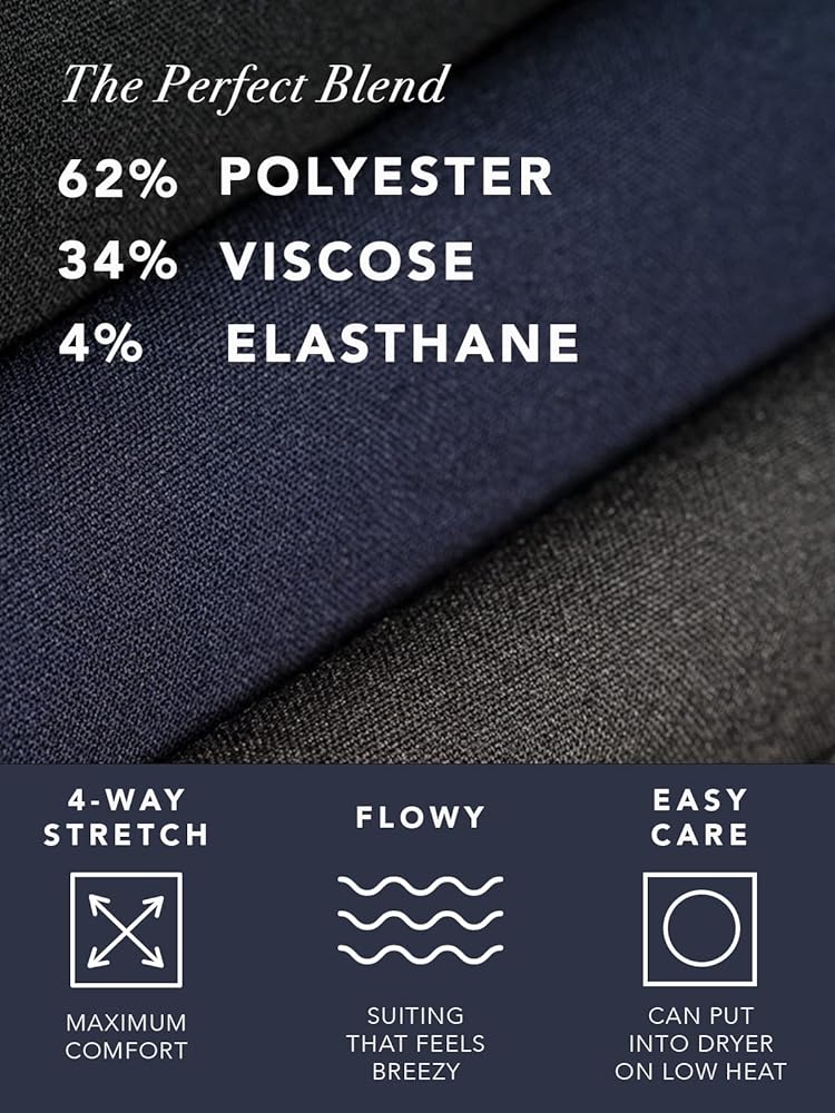 نسيج ناعم وثنائي التمدد: نسيج مطاطي محسن يمتد في 4 طرق لتوفير أقصى درجات الراحة. مزيج من البوليستر/الرايون/الإسباندكس. تقنية Super Crease (تظل التجاعيد ثابتة لعدة مرات غسل)