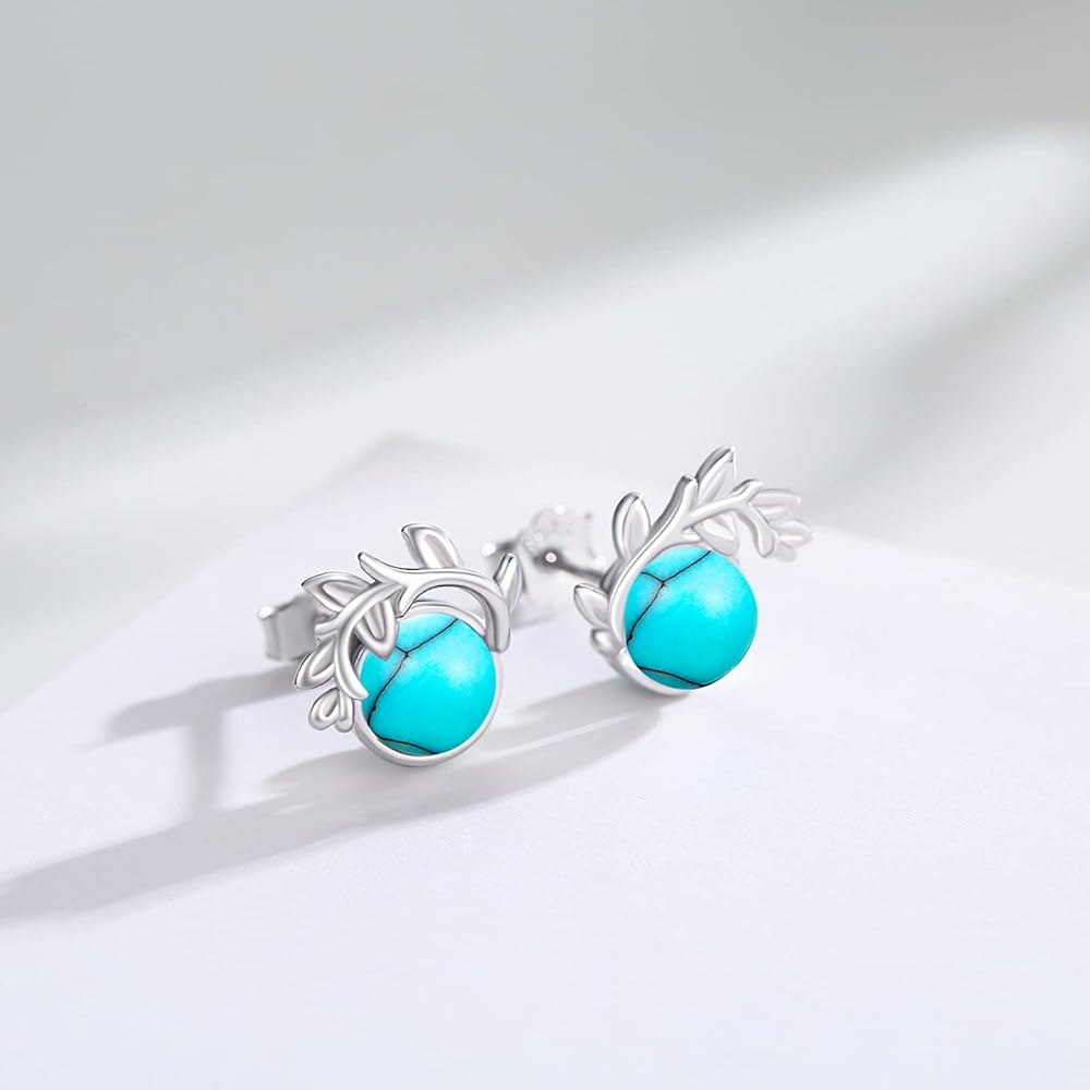 S925 Sterling Silver Leaf Turquoise/Opal Stud Earrings Small Leaves Round Studs Hypoallergenic Turquoise Earrings Turquoise Jewelry Gift for Women Teen Girls Birthday Valentine's Day Gift