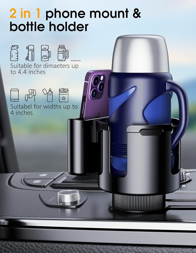 • [حامل أكواب وهاتف 2 في 1 للسيارة] يمكنه تحميل زجاجات المشروبات والهواتف المحمولة في نفس الوقت. يحافظ على هاتفك الخلوي ومشروباتك في متناول اليد.